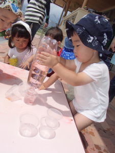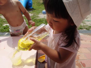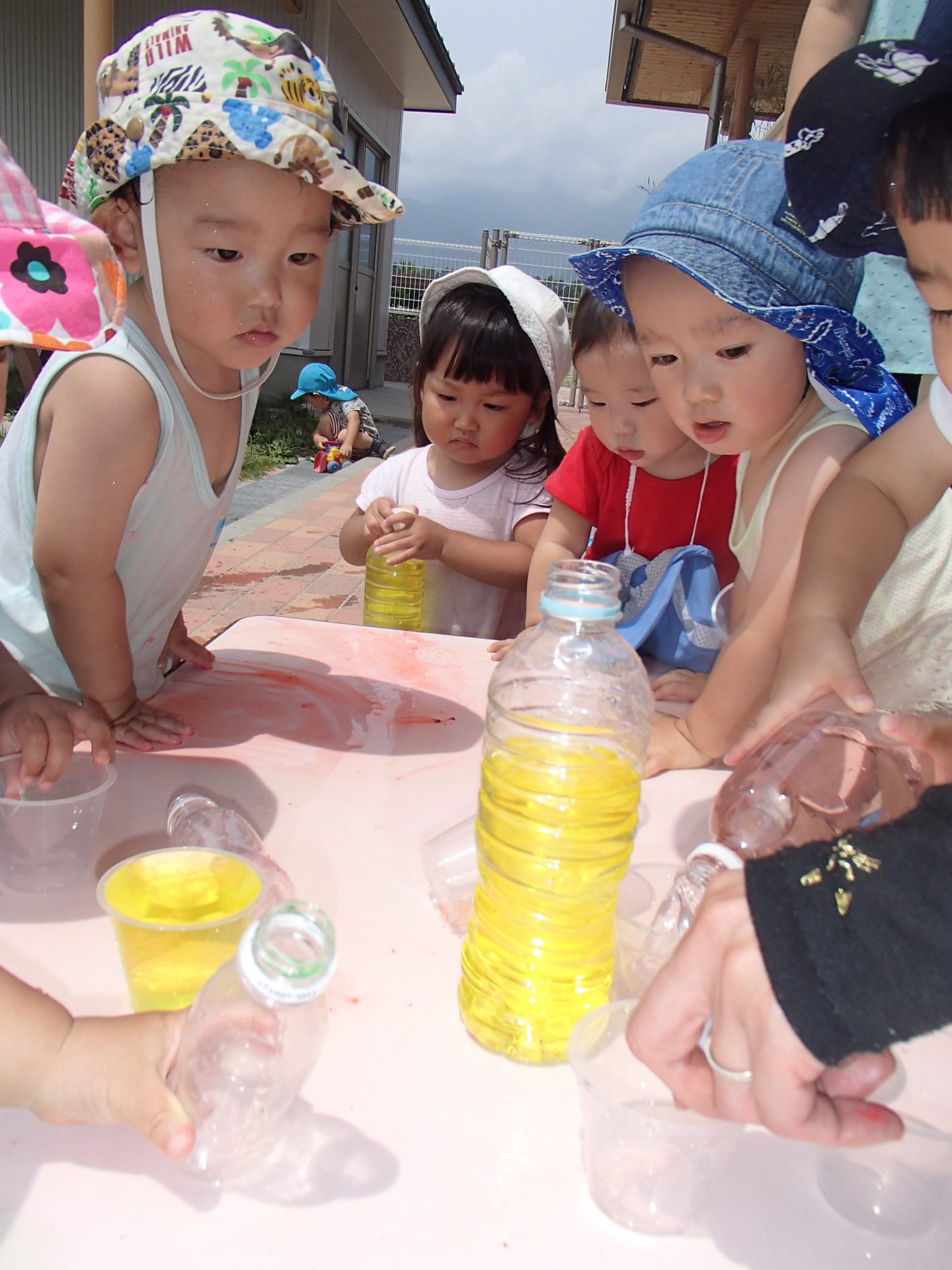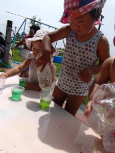 ・身近な色水遊びを通して、自分のいろいろな思いを感じ、積極的に『水』に関わることで、次の遊びにつなげていきたいと思いました。