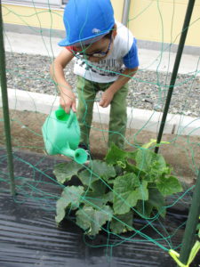 子どもたちは野菜の活動で、においや手触りを感じ、水やりをすることで野菜は生長することを知りました。