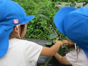 なすときゅうりの苗から、それぞれの野菜のにおいがあることを知った子どもたちは、次にきゅうりの花が咲き、きゅうりができることにとても大きな期待をもつことができていました。自分たちが水やりをしたり、雨が降ってくれることで野菜が生長するということに気づいた活動です。