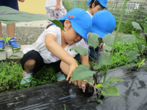 「せんせい! きゅうりがなってる」「なすもできてる」