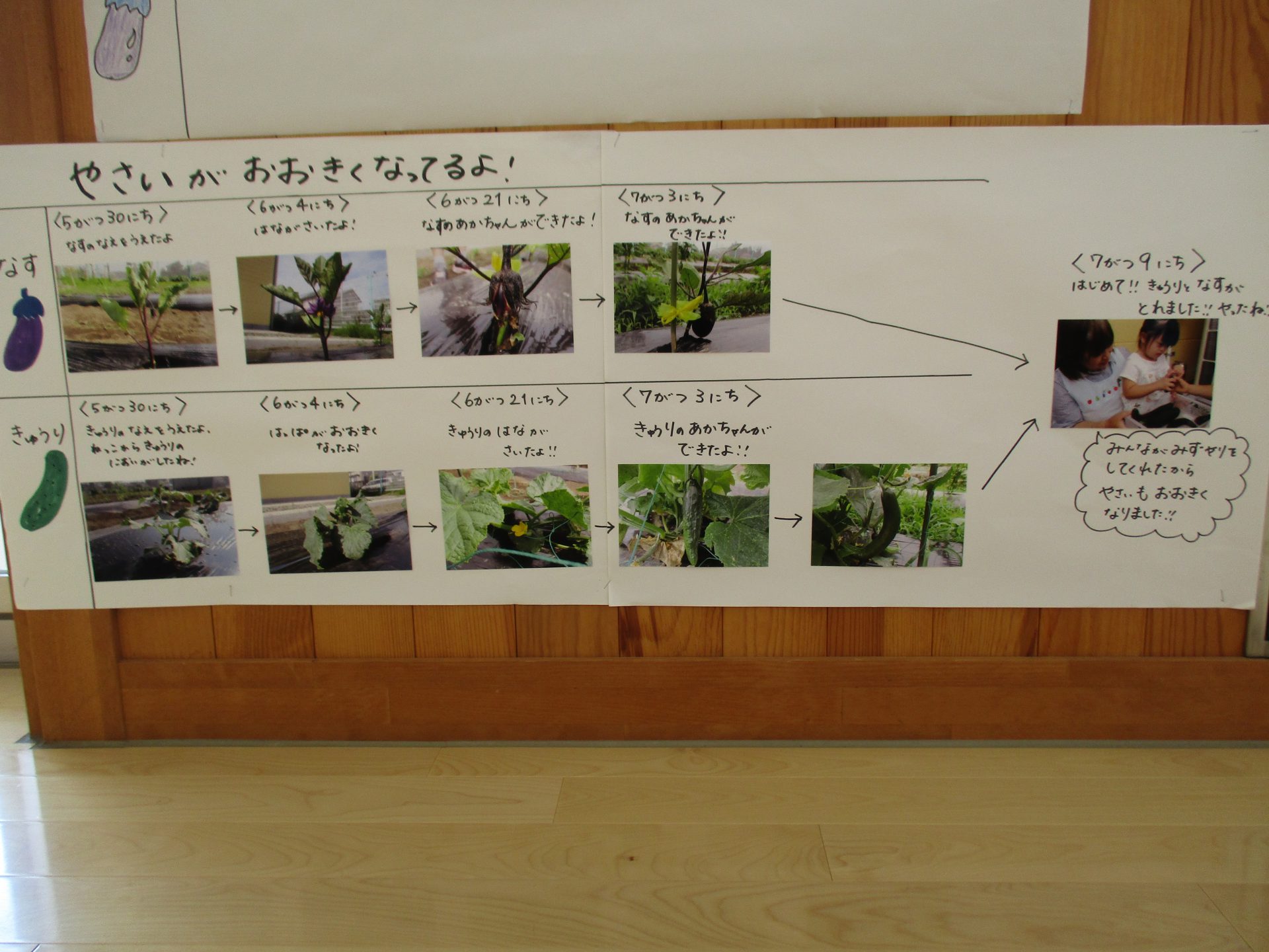 当番活動で野菜の水やりをしています。 生長の段階を写真に撮り掲示してみました。