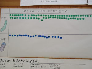 そして、収穫する時には「いくつ野菜がとれるかな?」の表にシールを貼ることで目で見てとれた野菜の数を数えることも知りました。