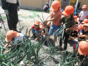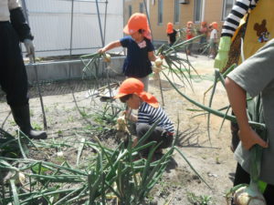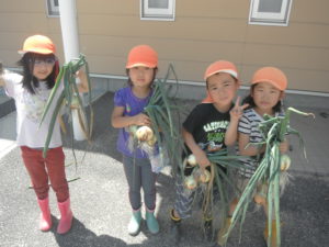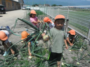 今度は干した玉ねぎを夏野菜と共に、カレー会で自らお料理をして全園児で食べ楽しみたいと思います。一つの収穫物が色々な料理に変身したり、どんな風に保存したらいいか分かったりできた事がとても嬉しく楽しい活動になりました。