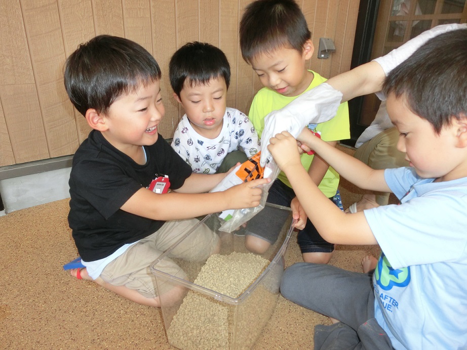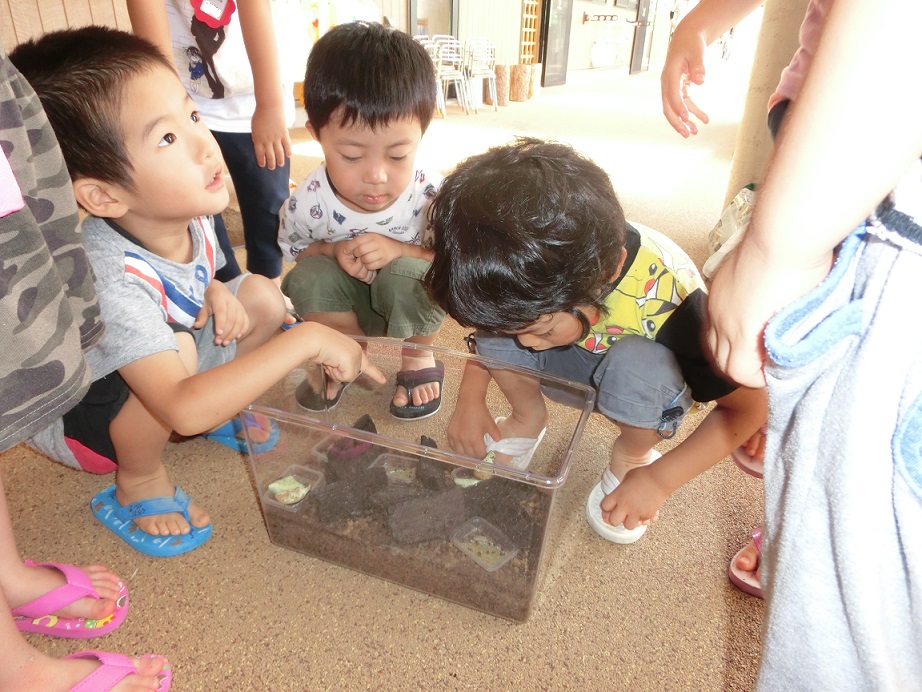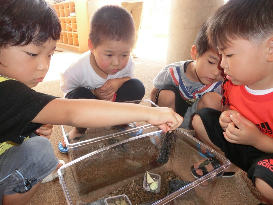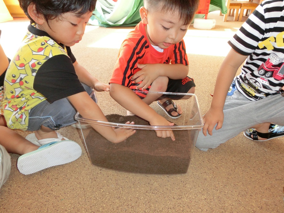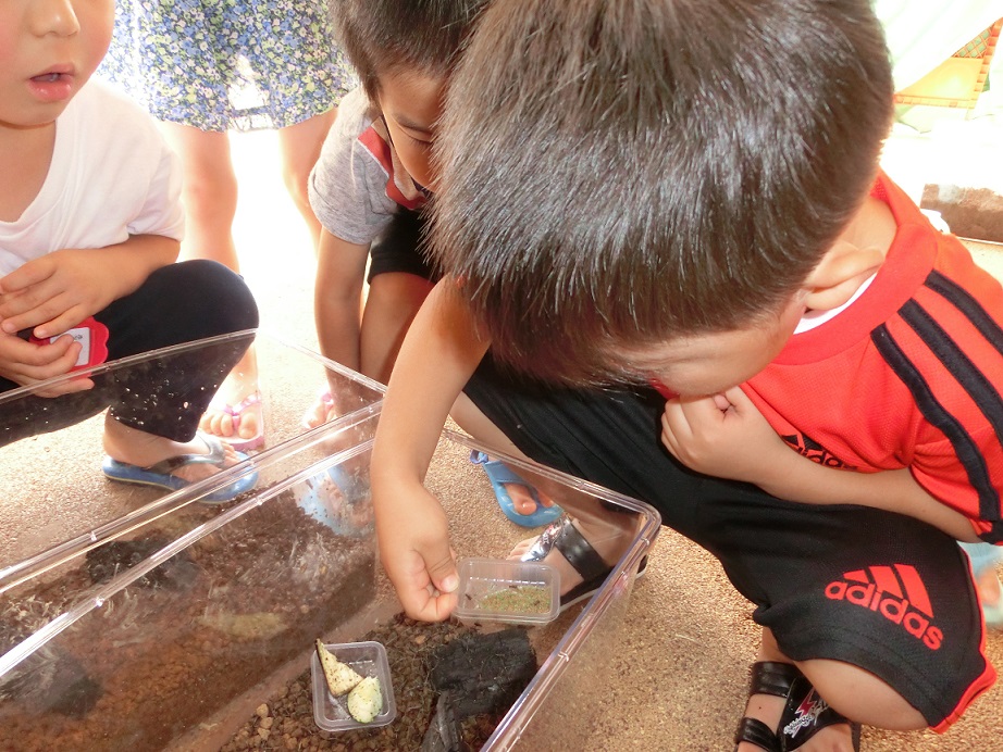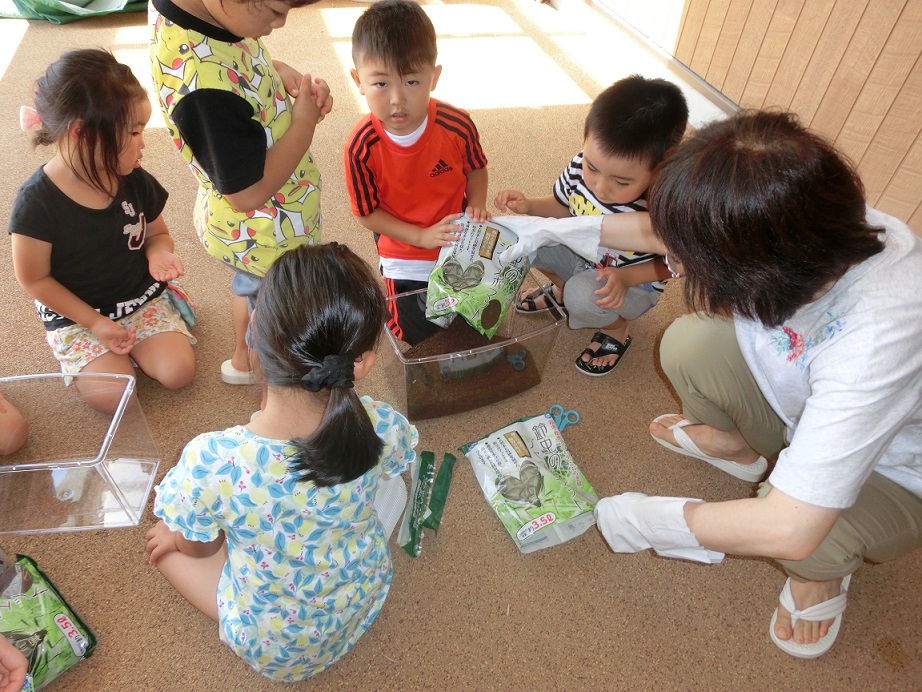 地域の方から鈴虫の赤ちゃんをたくさんいただきました。保育園で飼育することにしました。年中児が保育園の飼育ケースに引っ越しをさせます。