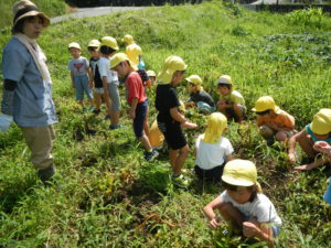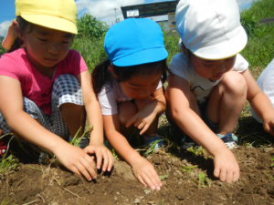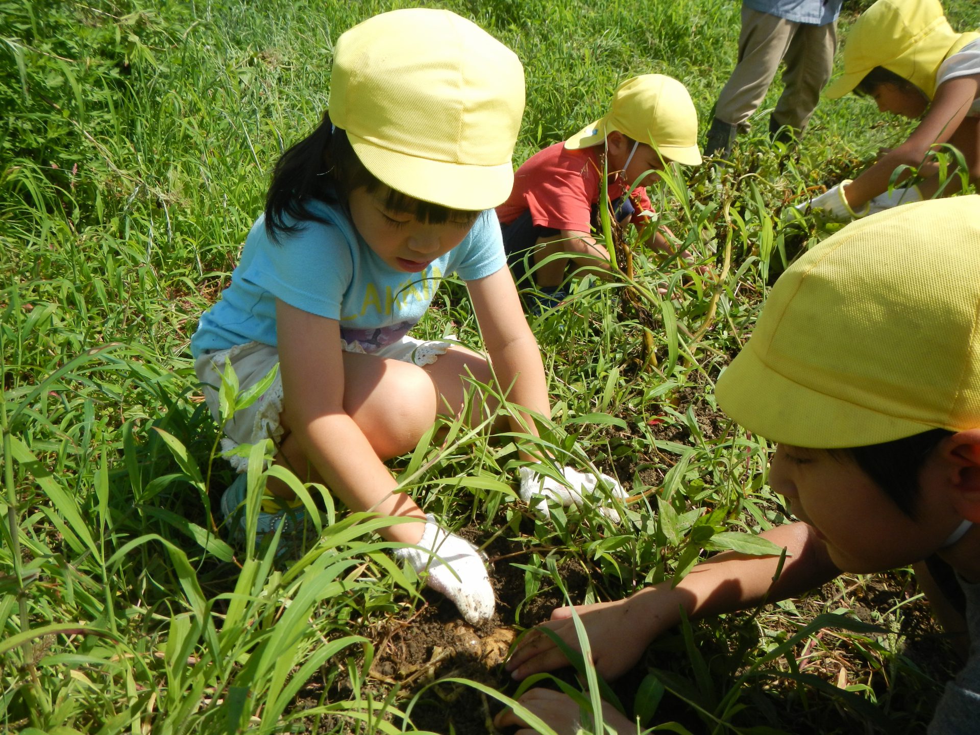 後日、残ったジャガイモもすべて収穫するために、年中さんも連れて畑に行きました。「こうやって掘るんだよ。採れたらあっちに持って行ってね」と年長さんが教えてくれました。