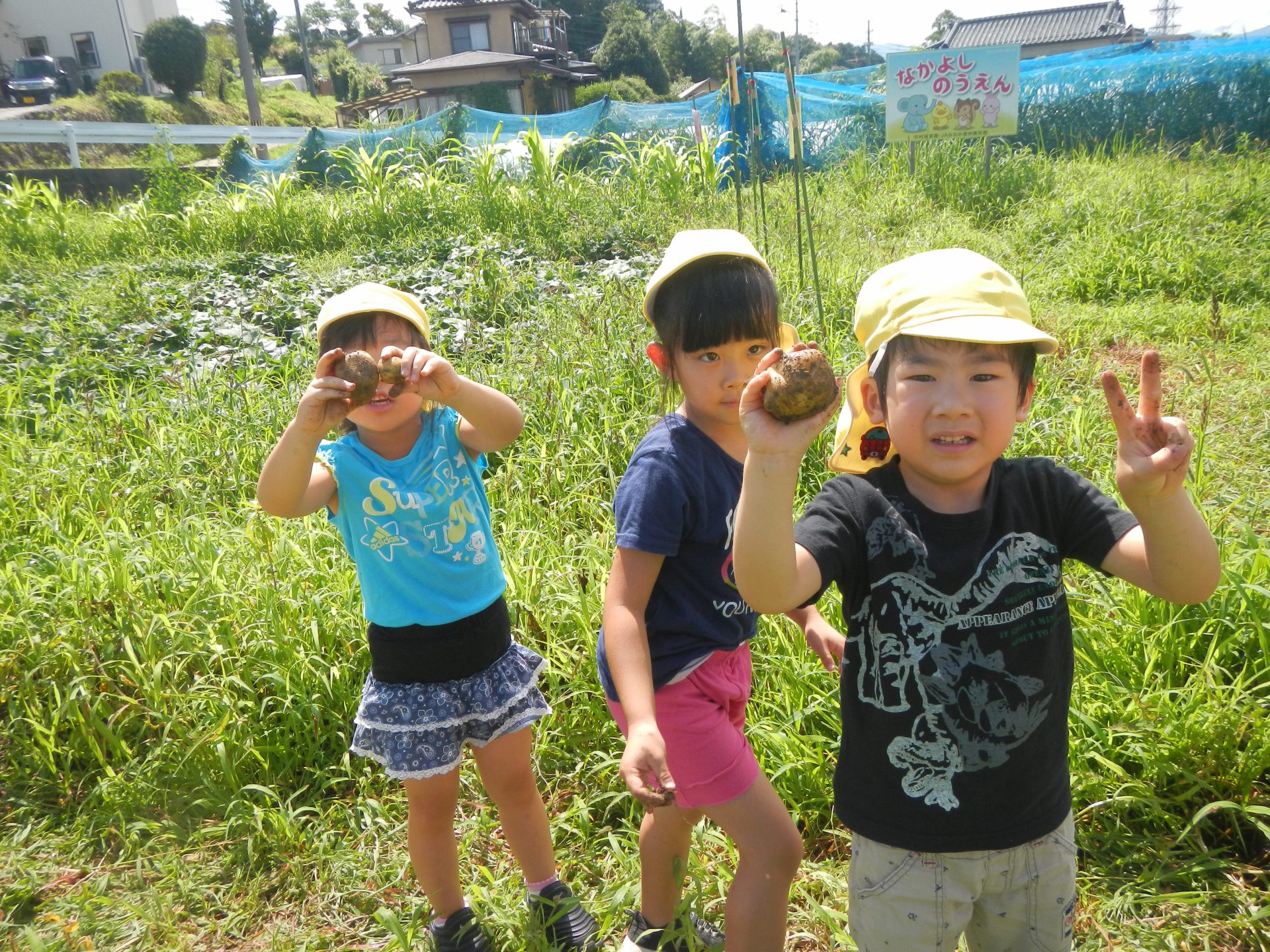 中村保育園には園庭にある畑とは別に、なかよし農園という大きな畑があり、JA青年部の方々に協力して頂きながら野菜を作っています。今日はジャガイモとスイカの収穫に来ました。