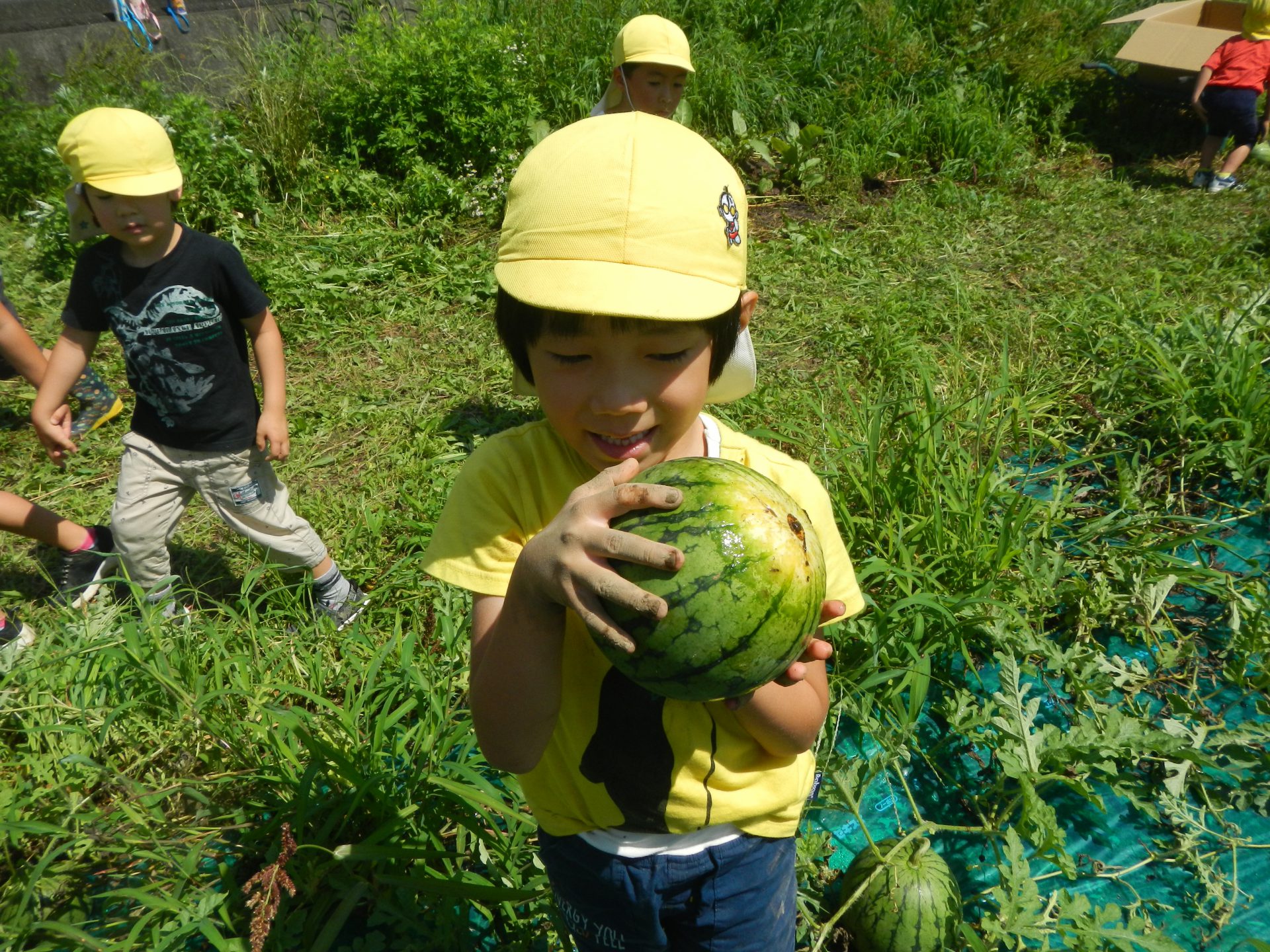 ジャガイモを収穫した後には、スイカの収穫も行いました。「重たいな・・・」と言いながらも、落とさないように大切に運んでくれました。