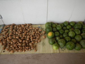 なかよし農園での大収穫。こんなにたくさんのジャガイモとスイカが収穫できました。収穫した野菜は給食で調理してもらったり、収穫祭(やさいパーティー)でクッキングをしておいしくいただきました。