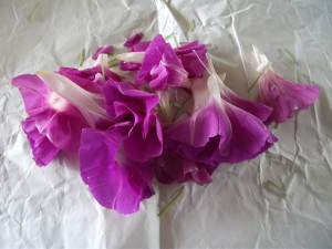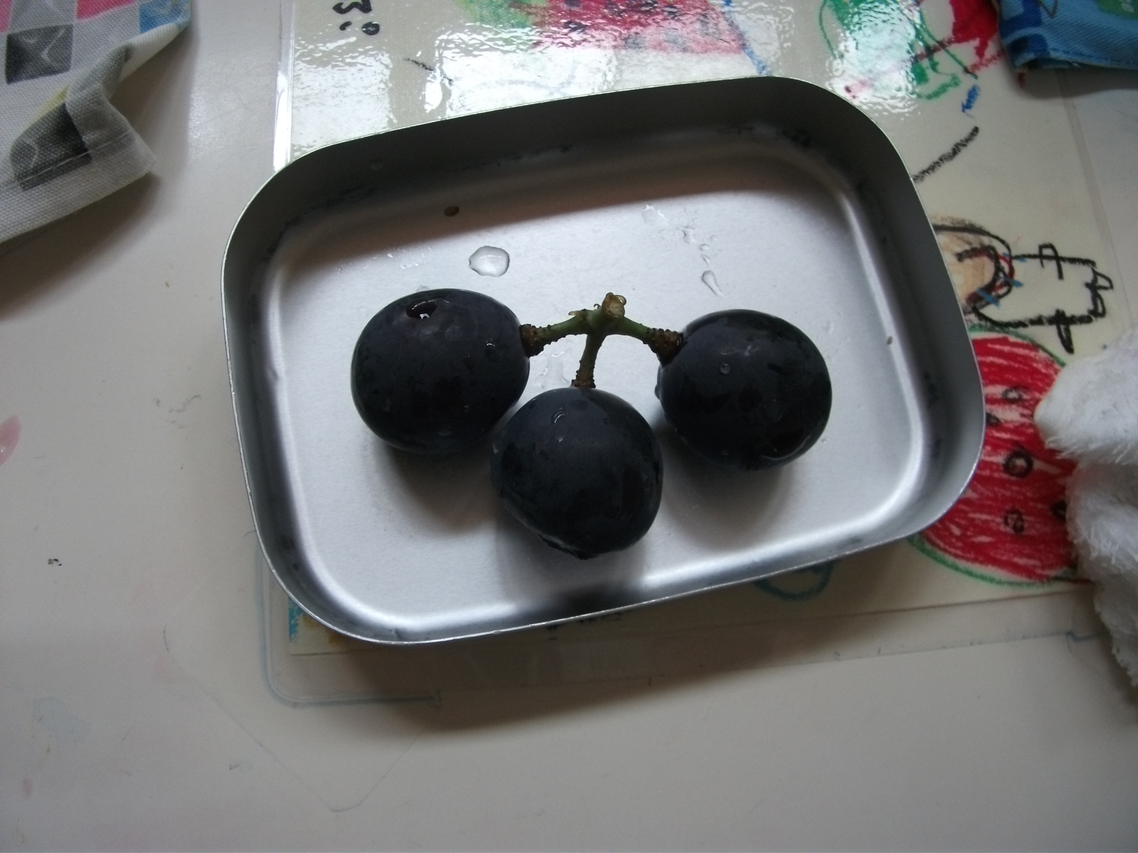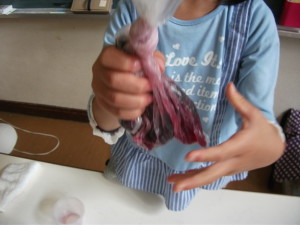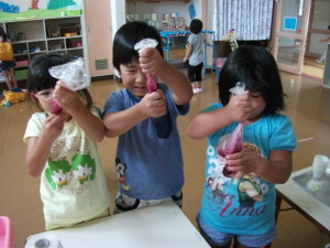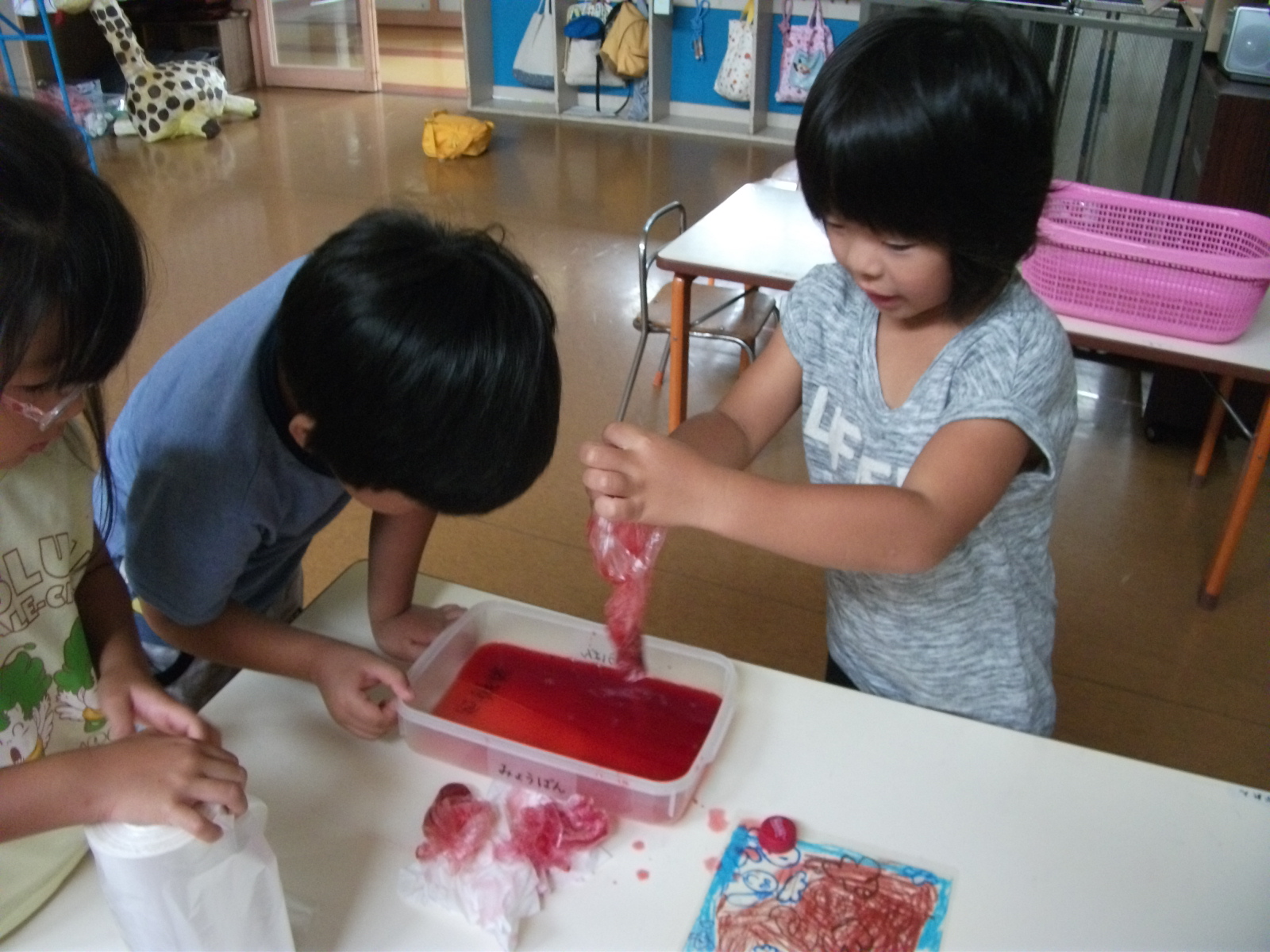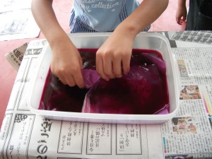 マリーゴールド、あさがおの他に今回は給食で出た巨峰も使って色水を作り染めてみました。