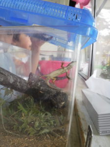 子どもたち同士で話したり、「カナヘビは何を食べるんだろう。」と図鑑で調べたりしていました。