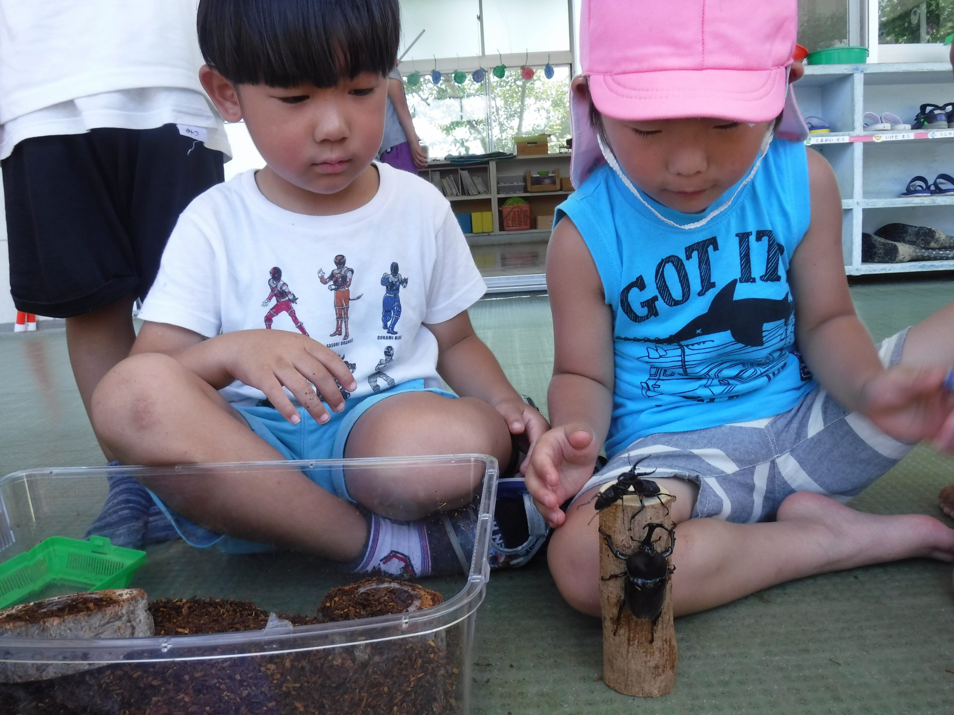 夏ならではの虫に触れながら友だちと楽しんでいます。