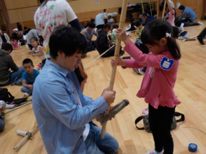 土曜参観日に親子で竹馬作りに取り組みました。親子で作りながら、