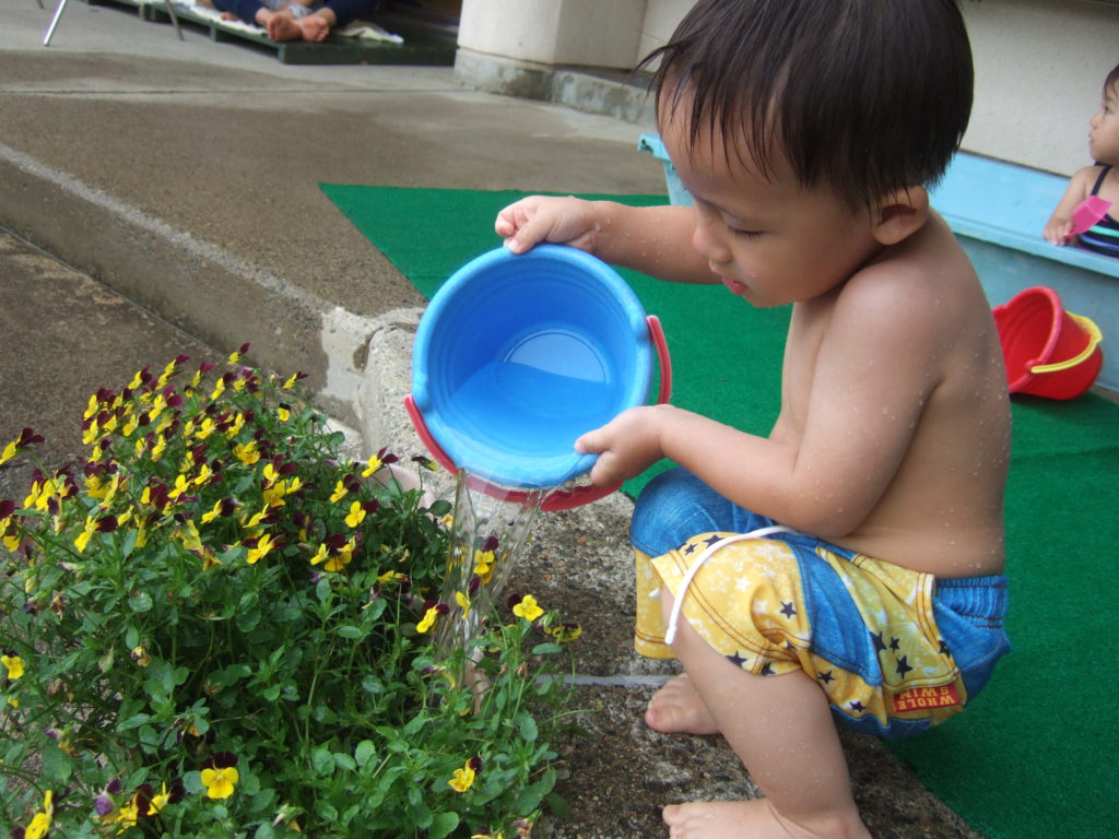泥んこ遊びで水を運んで楽しんでいたお友達。今度は、お花に水をくれています。