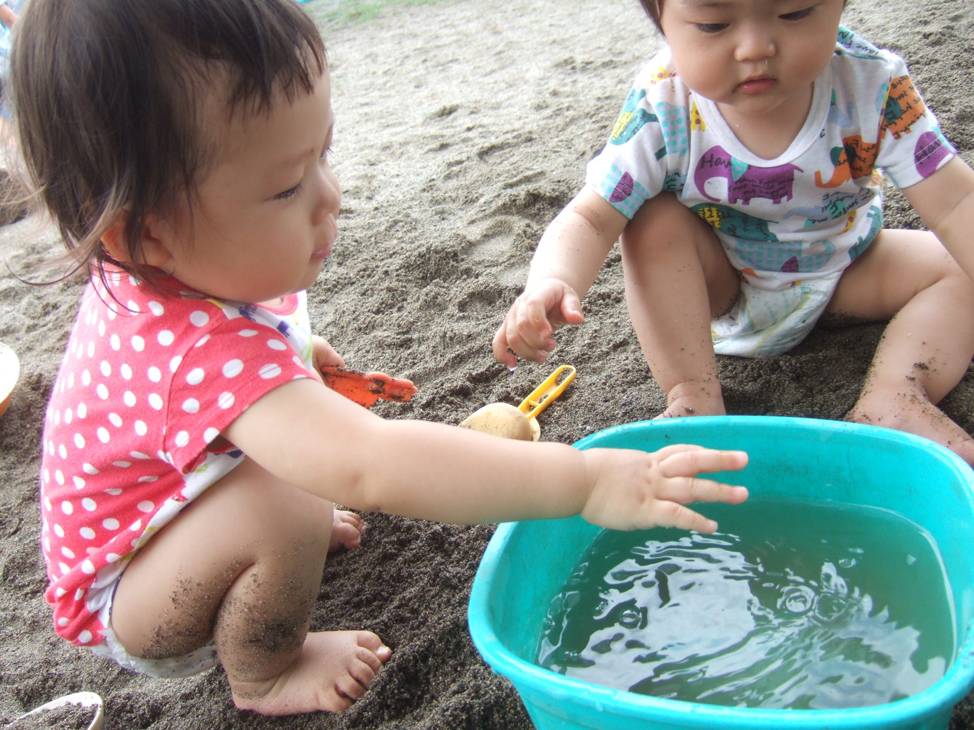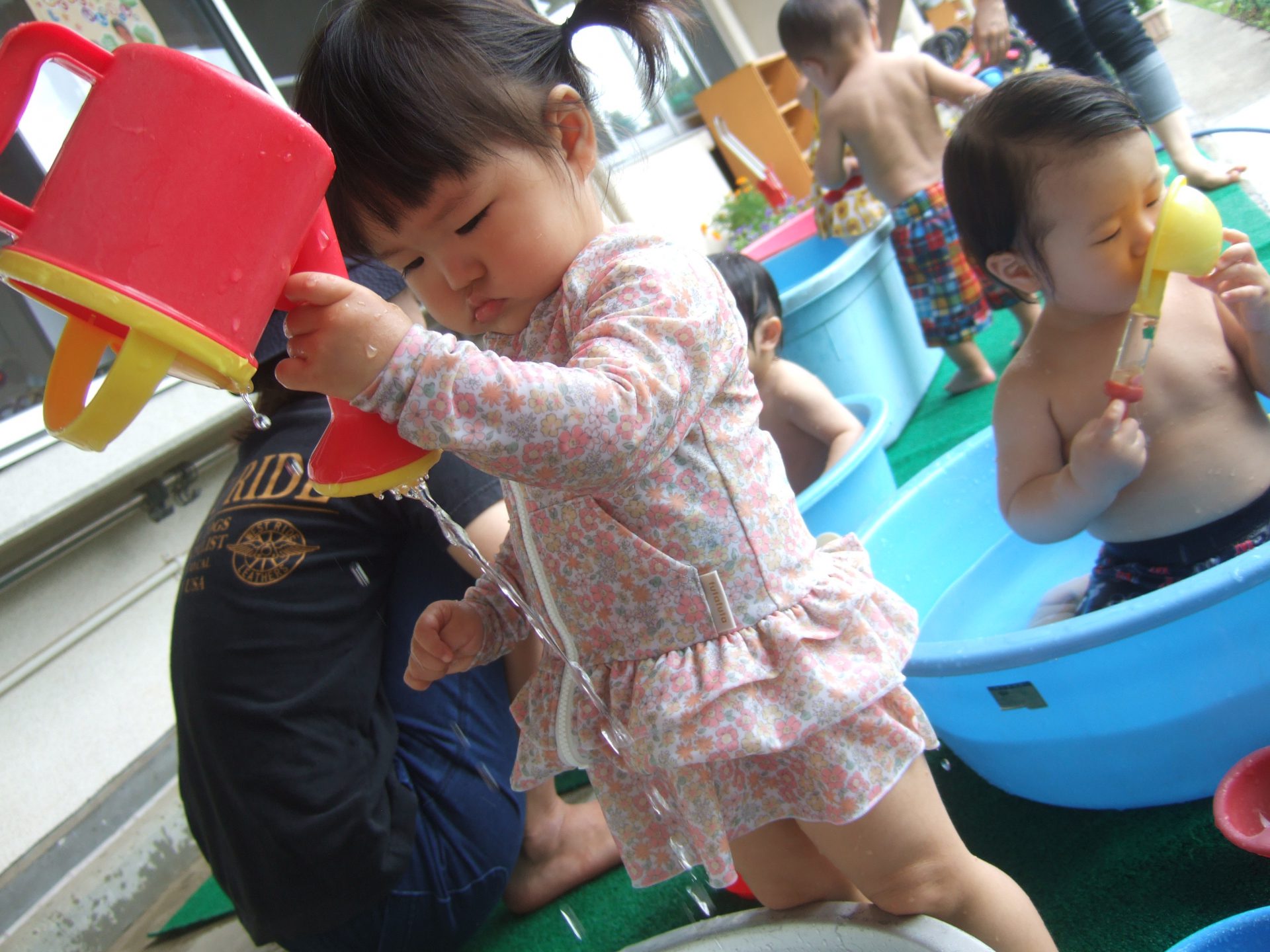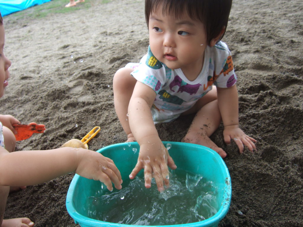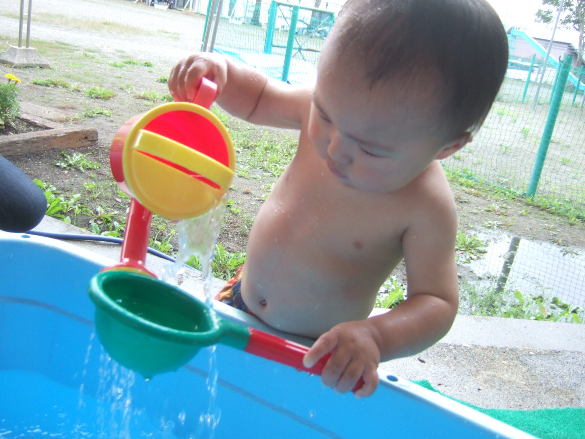 まずは、保育士と一緒にお友達の様子を見ていたのですが、だんだんと“水”にも興味が出てきたようです。