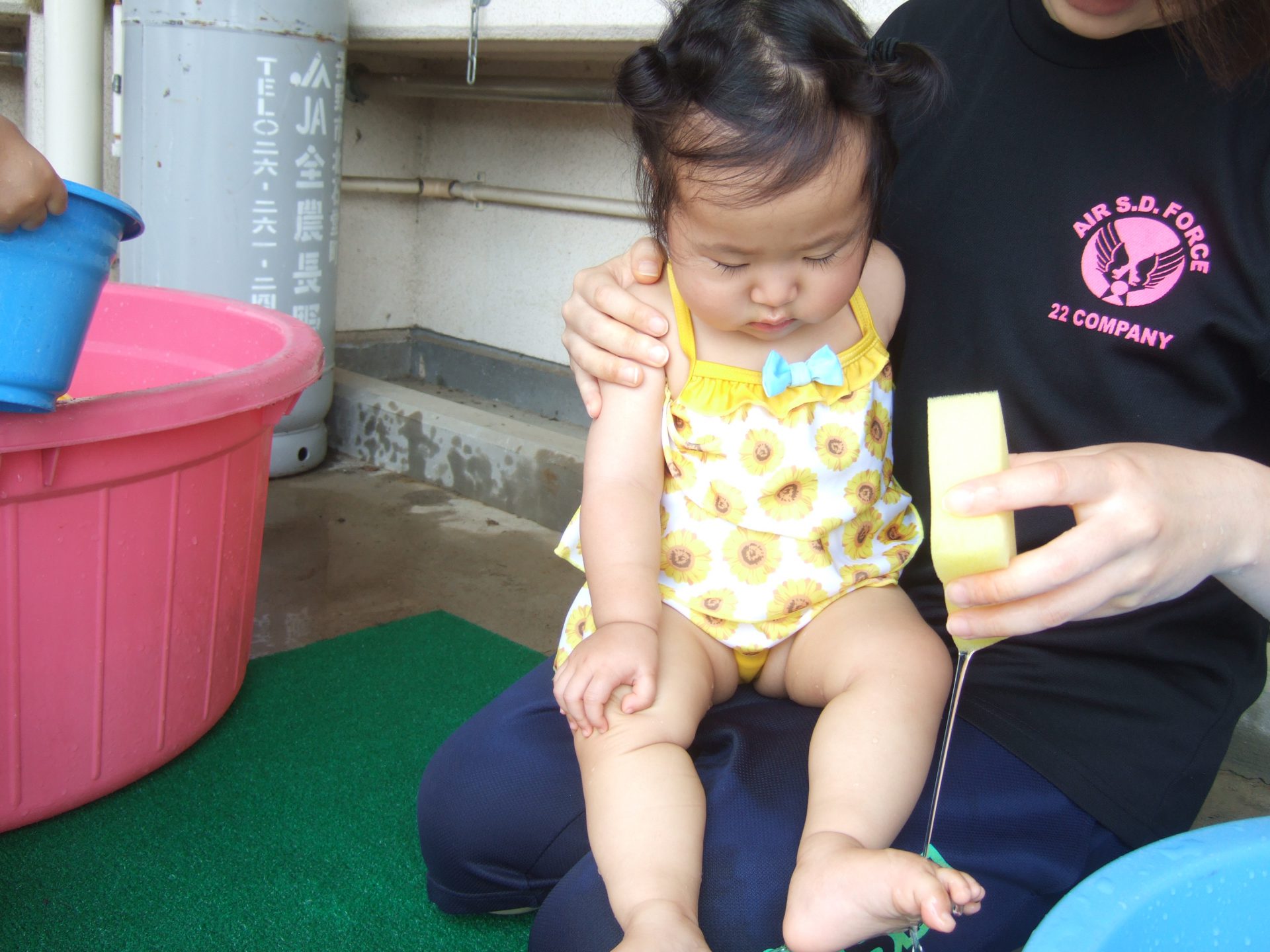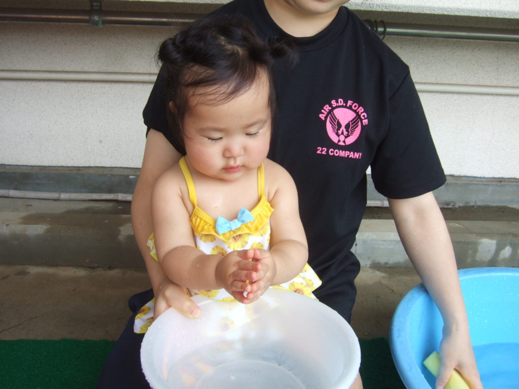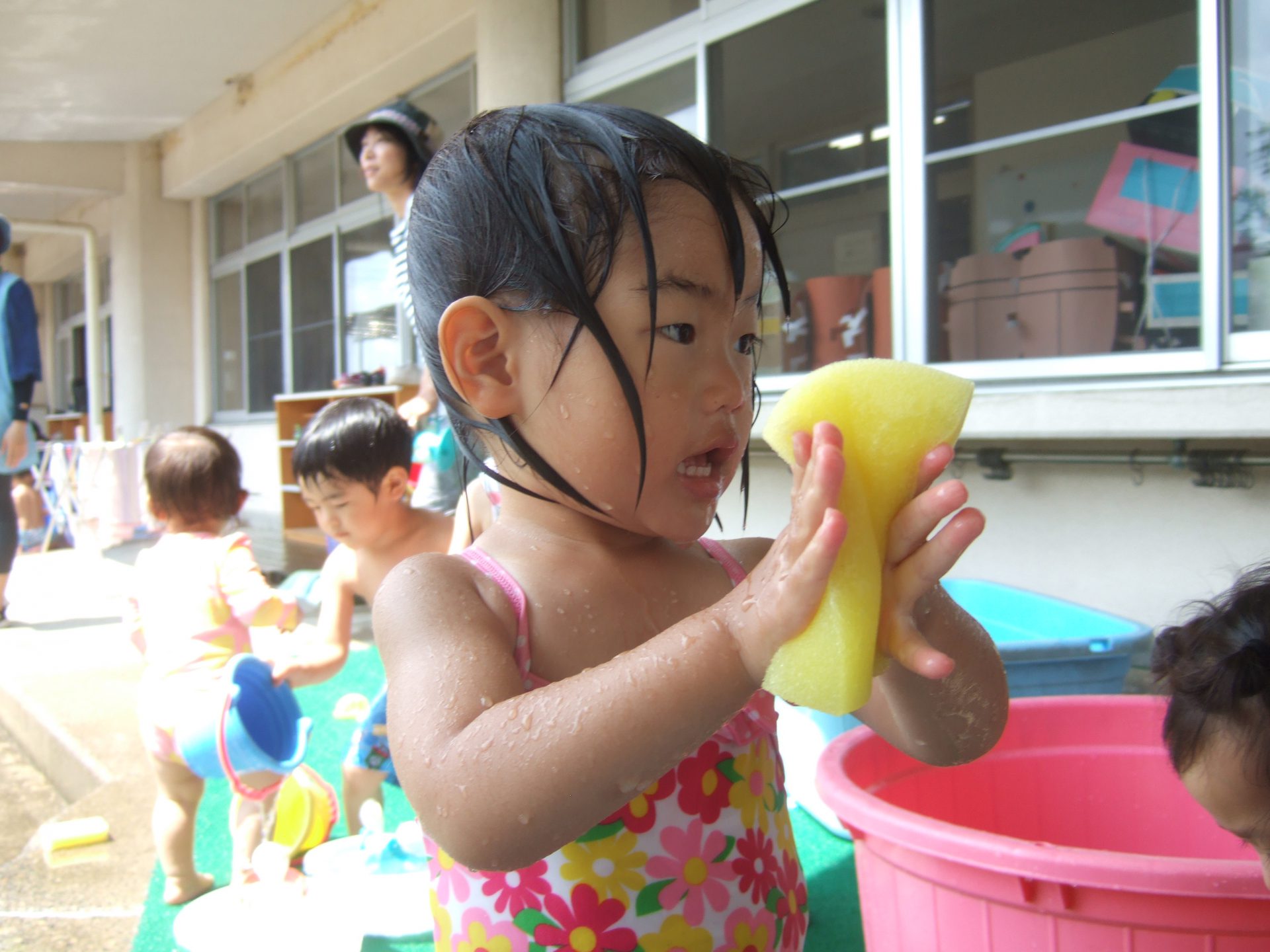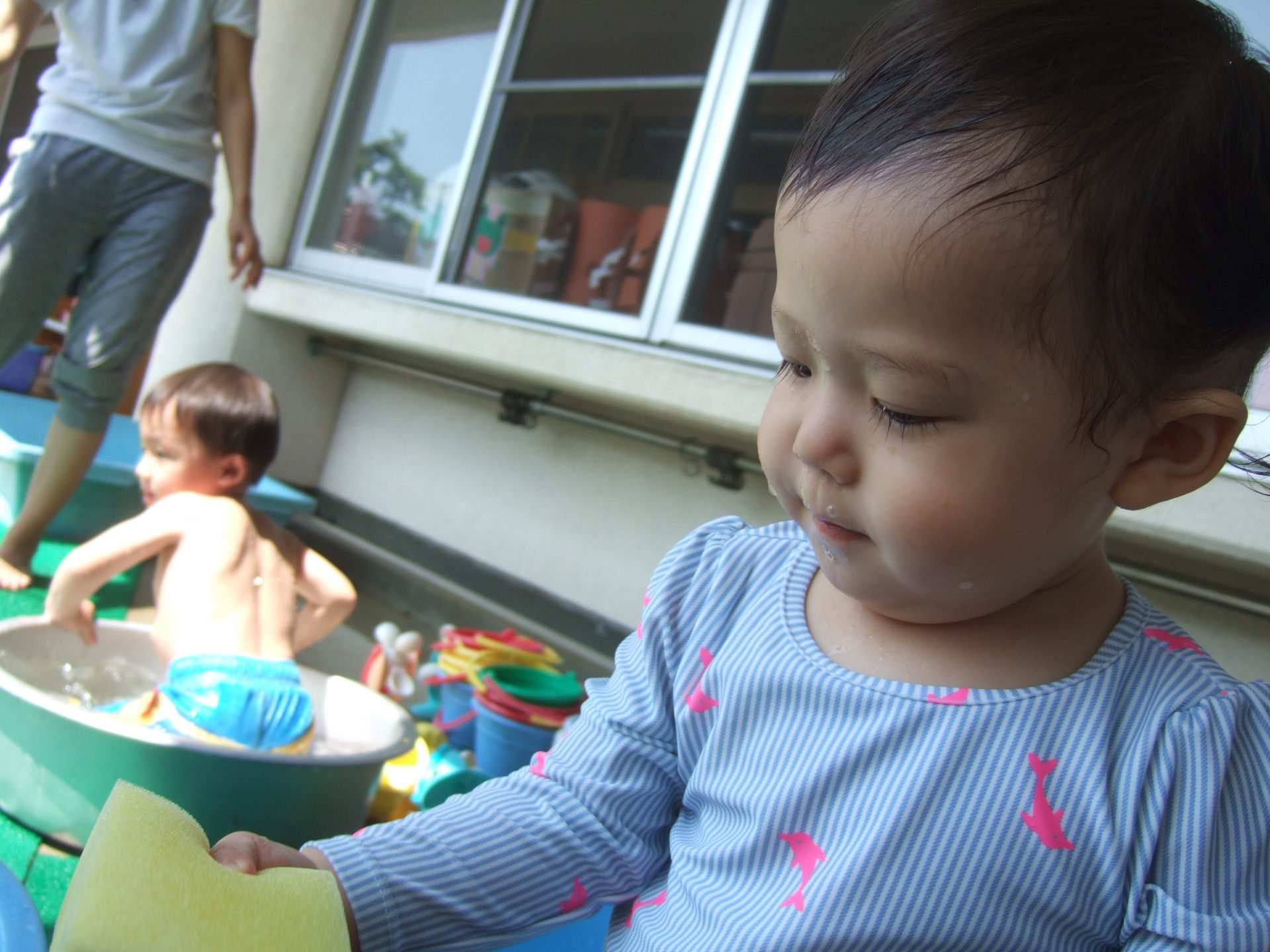 保育士がお友達にスポンジを絞って水をかけているのを見て笑っていたので、