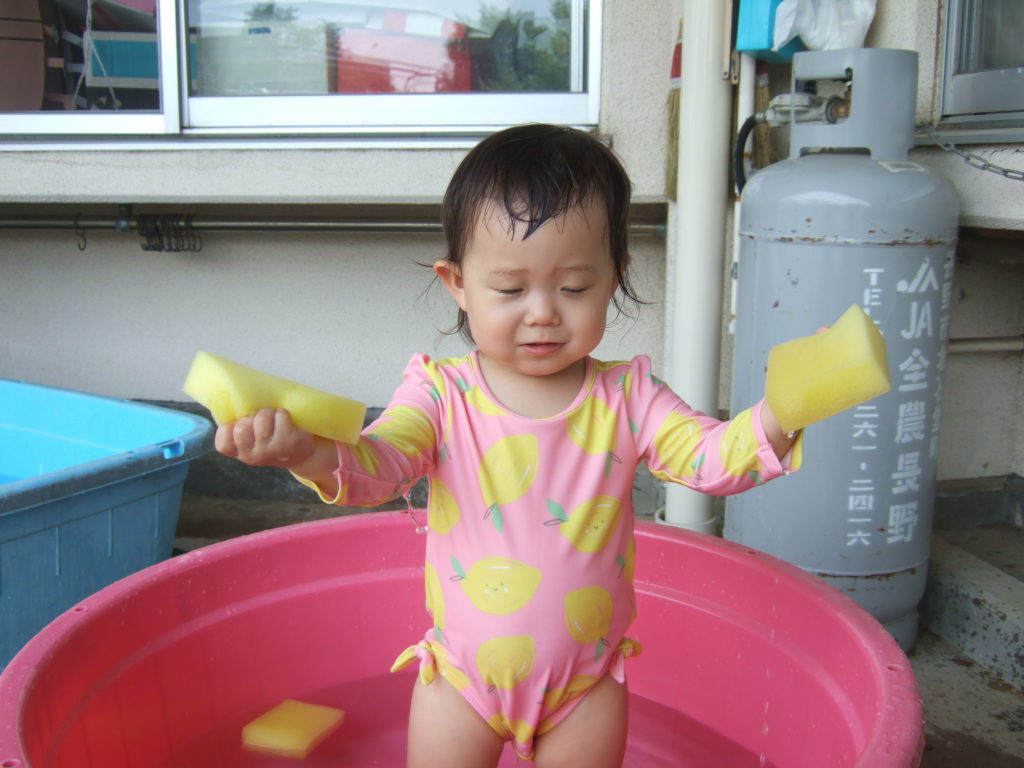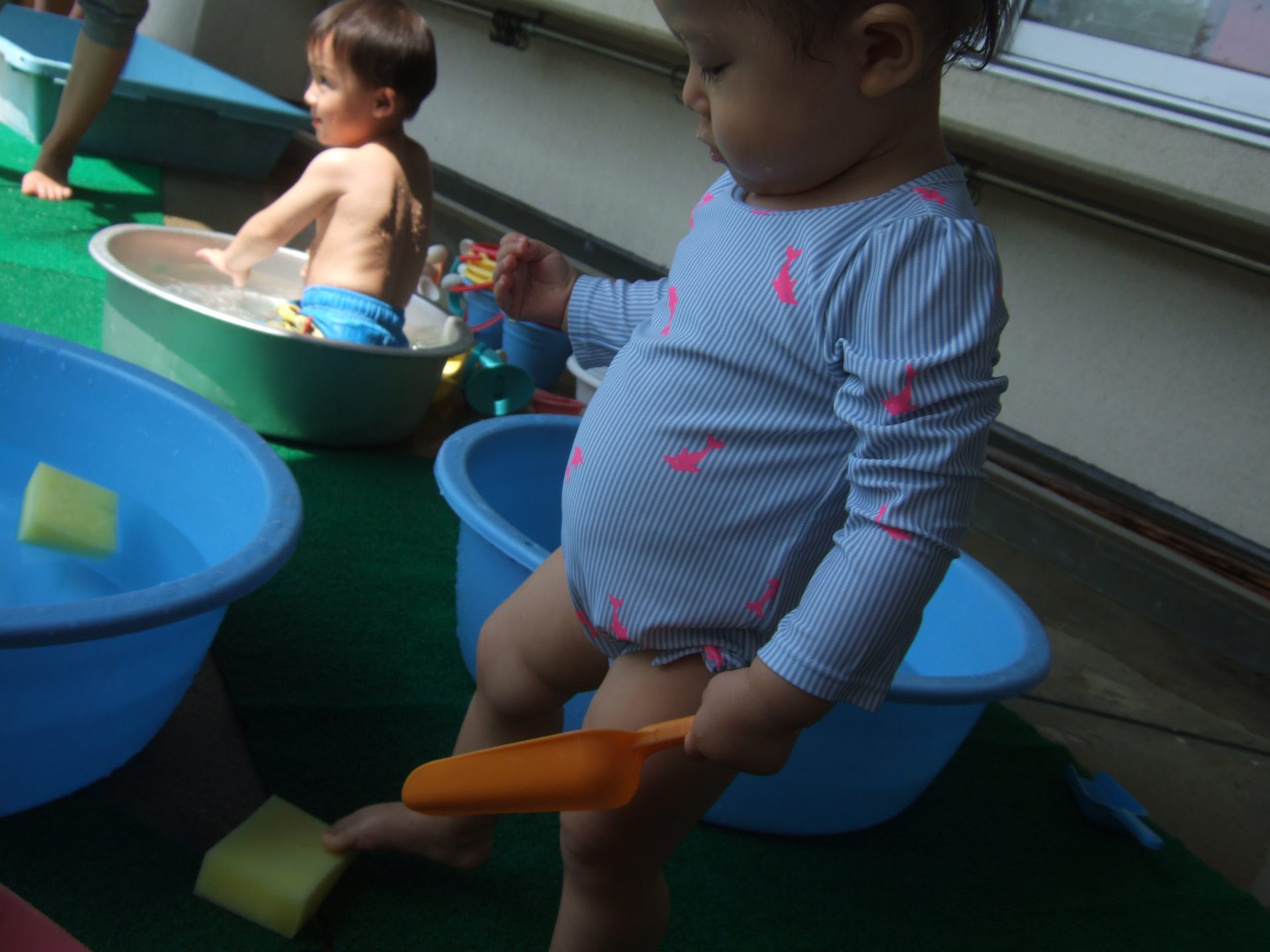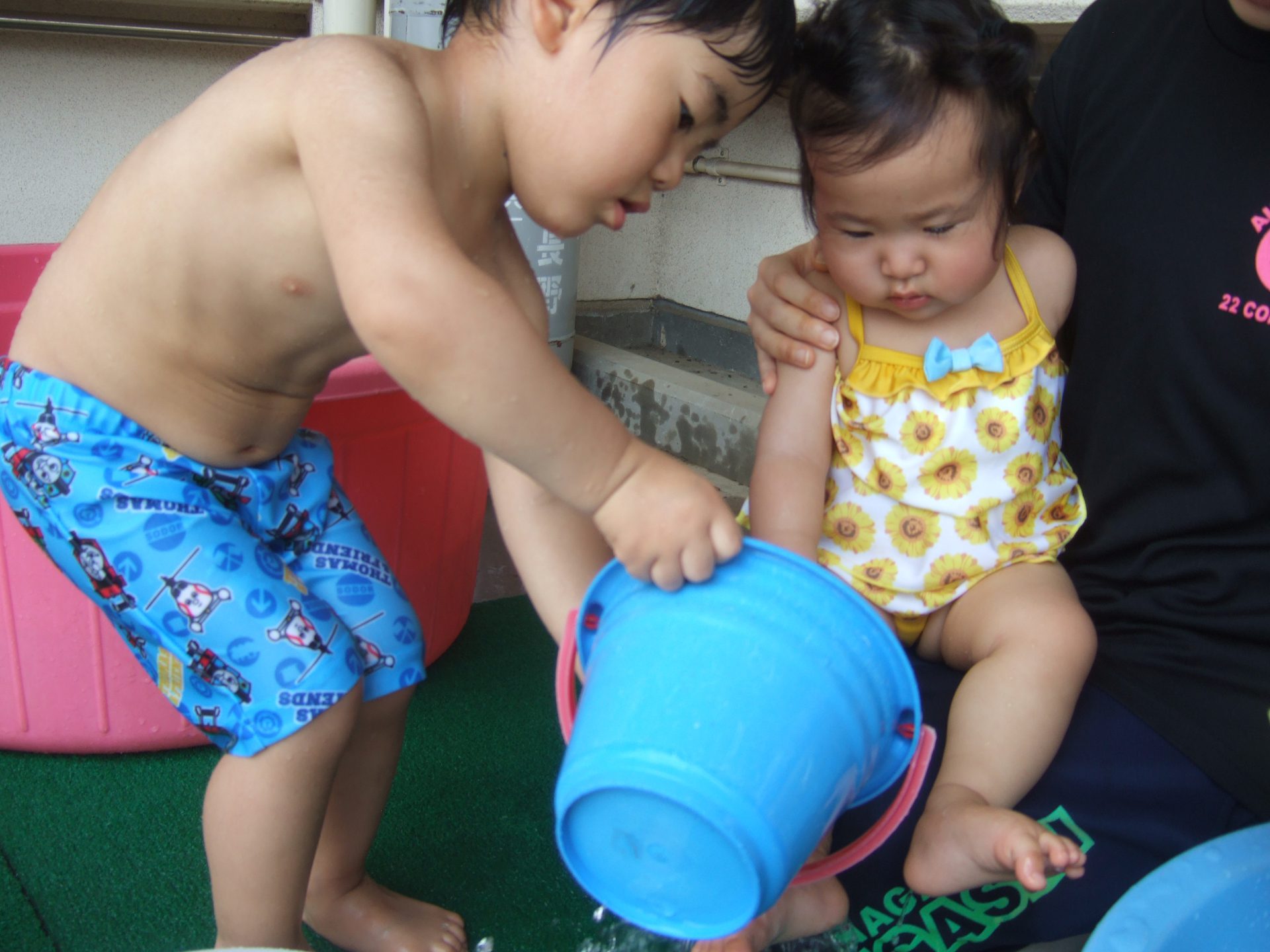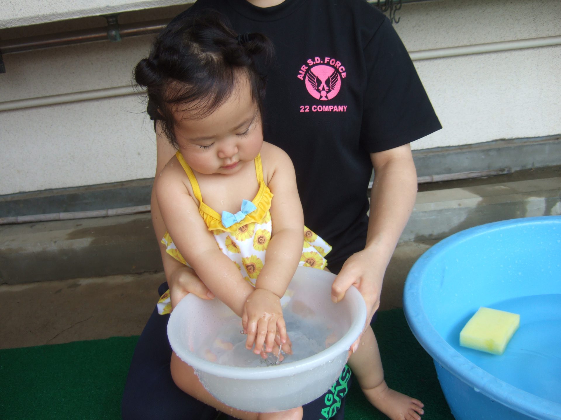 保育士がお友達にスポンジを絞って水をかけているのを見て笑っていたので、