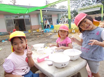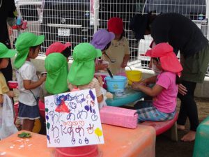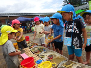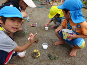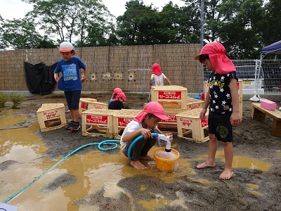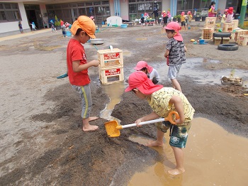 泥んこ遊びを通し、“考えてやってみる”をたくさん経験した子どもたち。今度は運動会に向けて、自分たちで砂を運び、温泉や川を埋め、園庭整備をしています。「いっしょにすなはこぼう」「こっちにもってきて」と自然に役割分担をし、友達と力を合わせて取り組む子どもたちの姿に少し成長を感じました。“考えてやってみる”この経験を繰り返していきたいと思います。