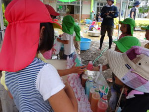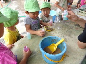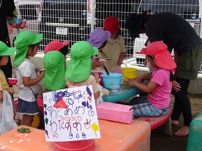 “考えてやってみる”は温泉作りだけではなく、他の遊びでも同じでした。しその葉・よもぎ・さつきの花・くわの実などの草花を使った色水遊び。「あれ?あんまりいろでない」「もむといいよ」「(すりこぎで)つぶすともっといろでるよ」と、どうすれば自分が満足する色になるか、夢中になっていました。自然の草花から出る色の美しさ、不思議さは子どもたちにとって魅力的なものだと改めて感じました。お店屋さんごっこでは「いろいろな色のジュースをつくりたい」ということで絵具のジュースになりましたが、「この色とこの色を混ぜると、〇〇ジュースになるね」と色の混ざりを考え、いろいろ試しながら、たくさんのジュースができあがりました。
