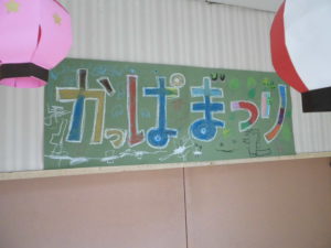 今年の夏祭りは年長さんが読んだ「でた!かっぱおやじ」の絵本からイメージが膨らみ”かっぱ祭り”を楽しむことになりました。
