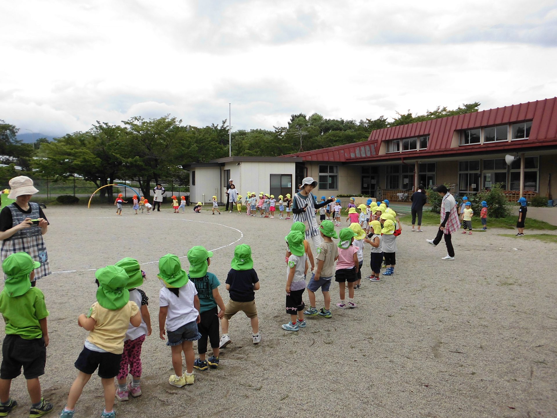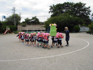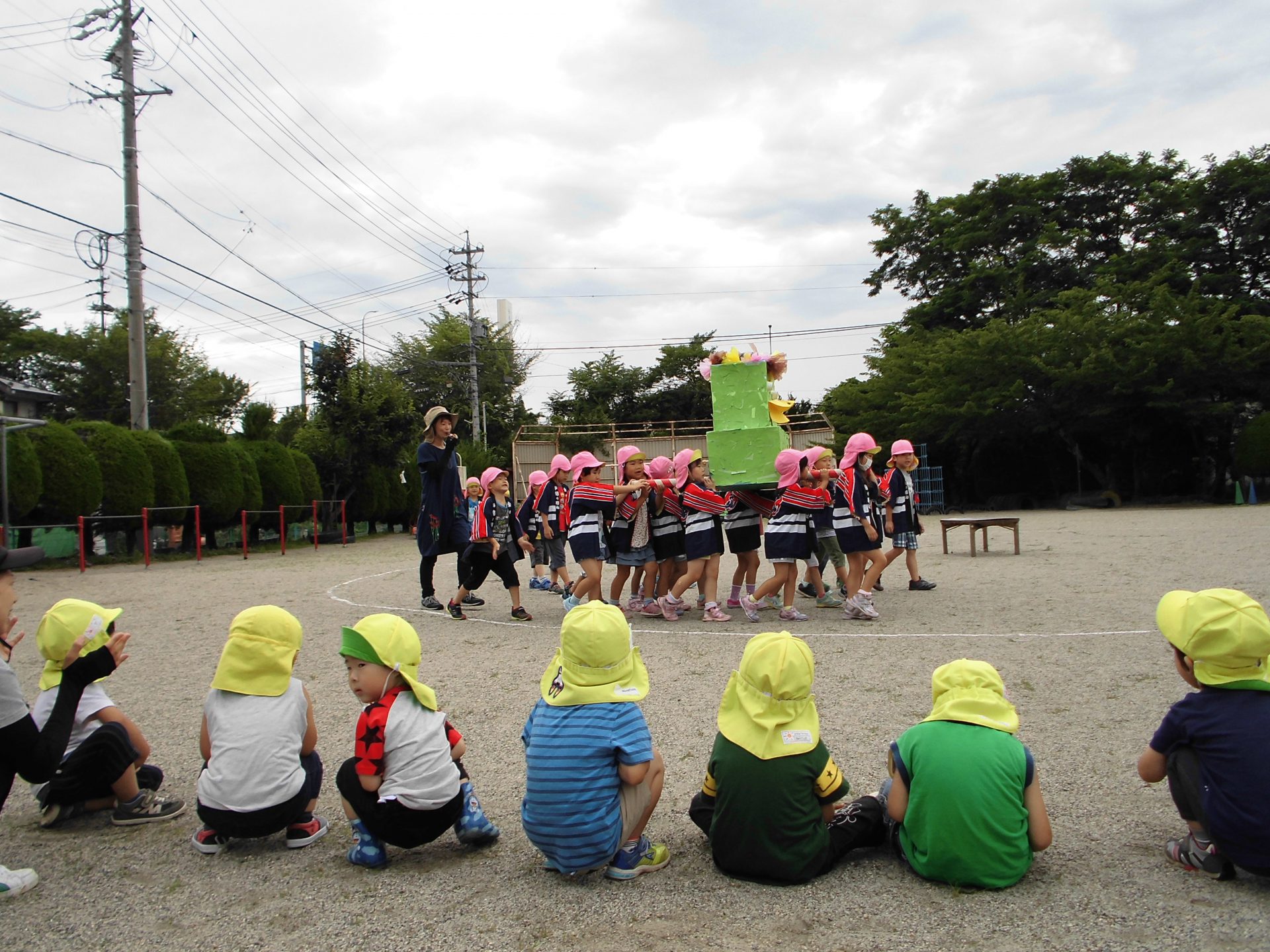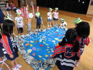 年長さんが小さい子どもたちを楽しませたいと、みんなで話し合い、お神輿やかっぱのお皿などこつこつと作ったり、やさしく声掛けをしてくれ、喜んでもらえた嬉しさも感じることができたことは、年長児にとってとても大きな成長になったと思います。また、小さな子どもたちも、年長児の優しさを感じたりあこがれを持ったりと、お互いが気持ちを通わせ合った活動でした。子どもたち全員の笑顔が輝いた子どもたちの ‶かっぱ祭り″ でした。