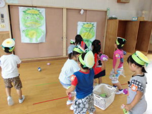 今年の夏祭りは年長さんが読んだ「でた!かっぱおやじ」の絵本からイメージが膨らみ”かっぱ祭り”を楽しむことになりました。