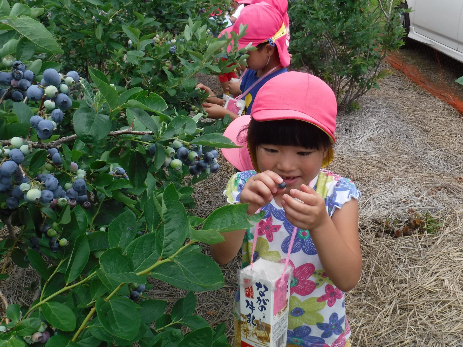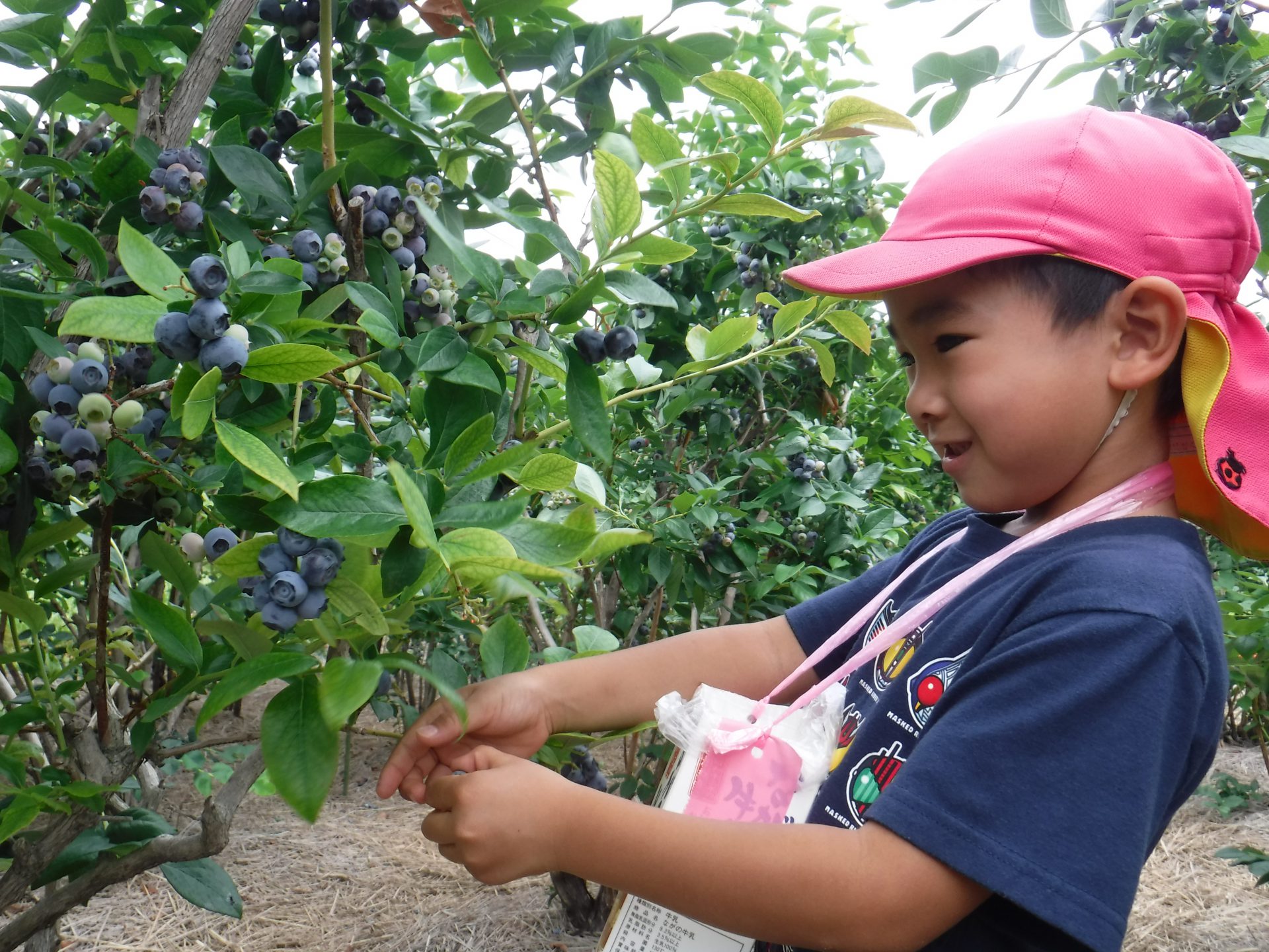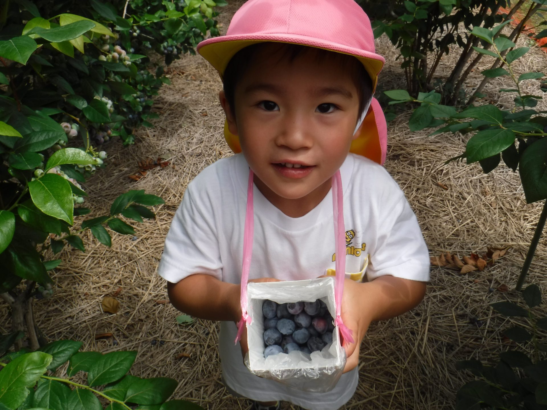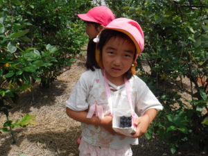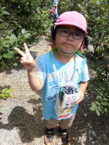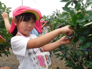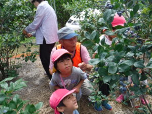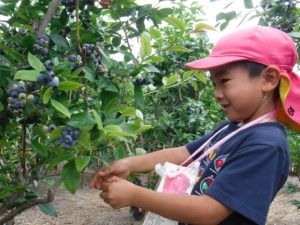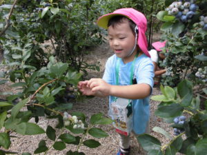 毎年、同じ地域にあるこども園のためにと、年長児を招いてくださり、牛乳パックいっぱいになるまでブルーベリーが採れること、また行きも帰りも一緒に歩いてくださり触れ合っていただけることに感謝の念がたえません。