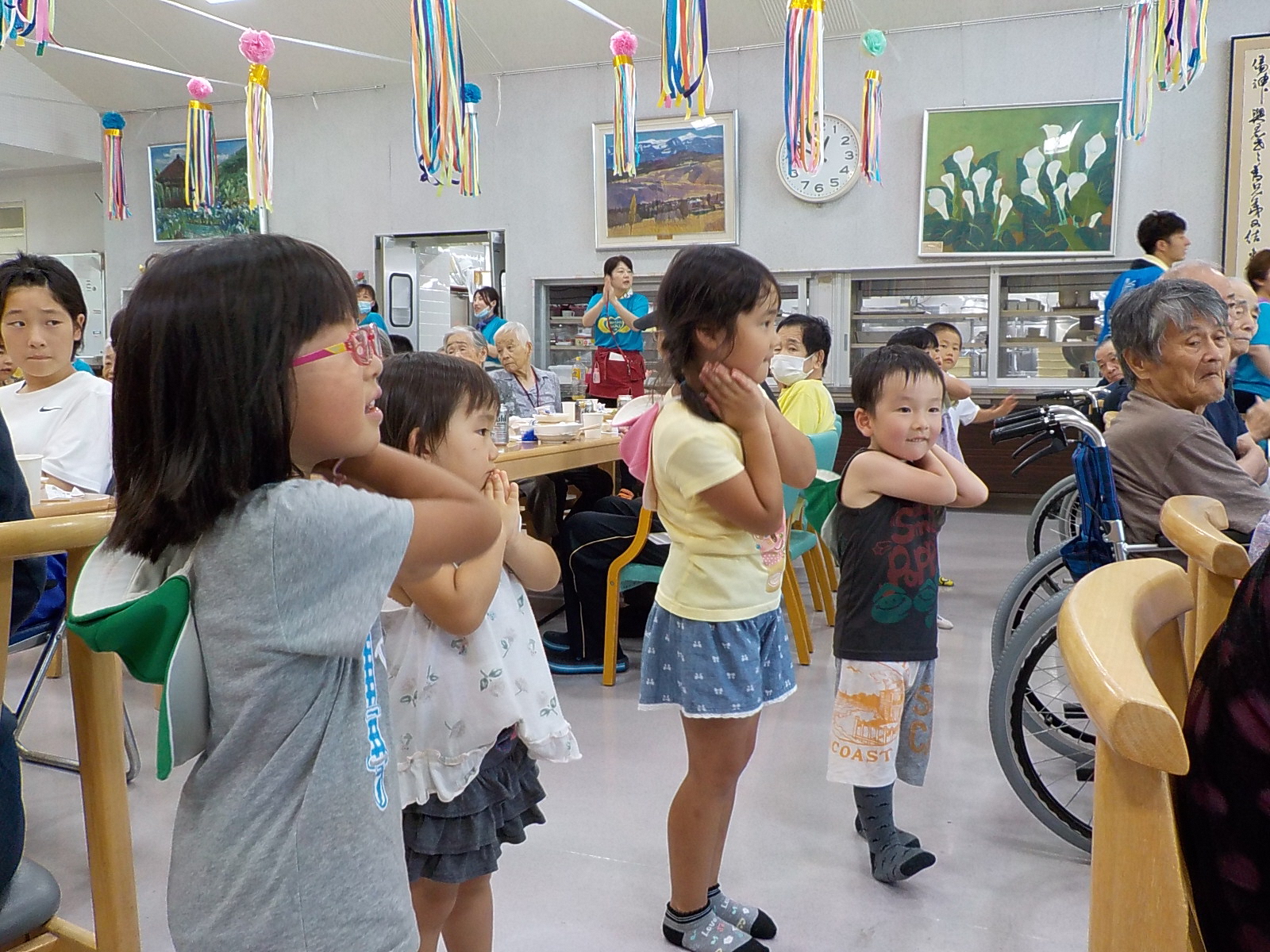 ステージに上がると「かわいいなー。」と微笑んでくれるおじいさん、おばあさんに、こどもたちも嬉しそうでした。