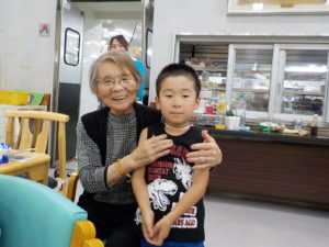 施設の方が来てくださったり、子ども達が訪問したり、お花見、夏祭り、運動会などの行事でも、交流させて頂いてます、子ども達は、おじいさんおばあさんに会うと挨拶をしたり、自然に会話が始まります。おじいさん、おばあさんの優しい表情や、言葉に子ども達も優しい表情になる姿を見て、保育士も癒されます。お互いを思う思いやりの気持ちをこれからも大切にしたいと思います。