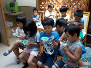 かき氷を食べながら、「暑い時にかき氷を食べると、口の中ですぐ溶けちゃう。」と口を大きく開けてみたり、「混ぜるとどんどん色がついて小さくなるよ。」とお互いのカップのなかをのぞきあっていました。