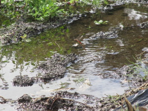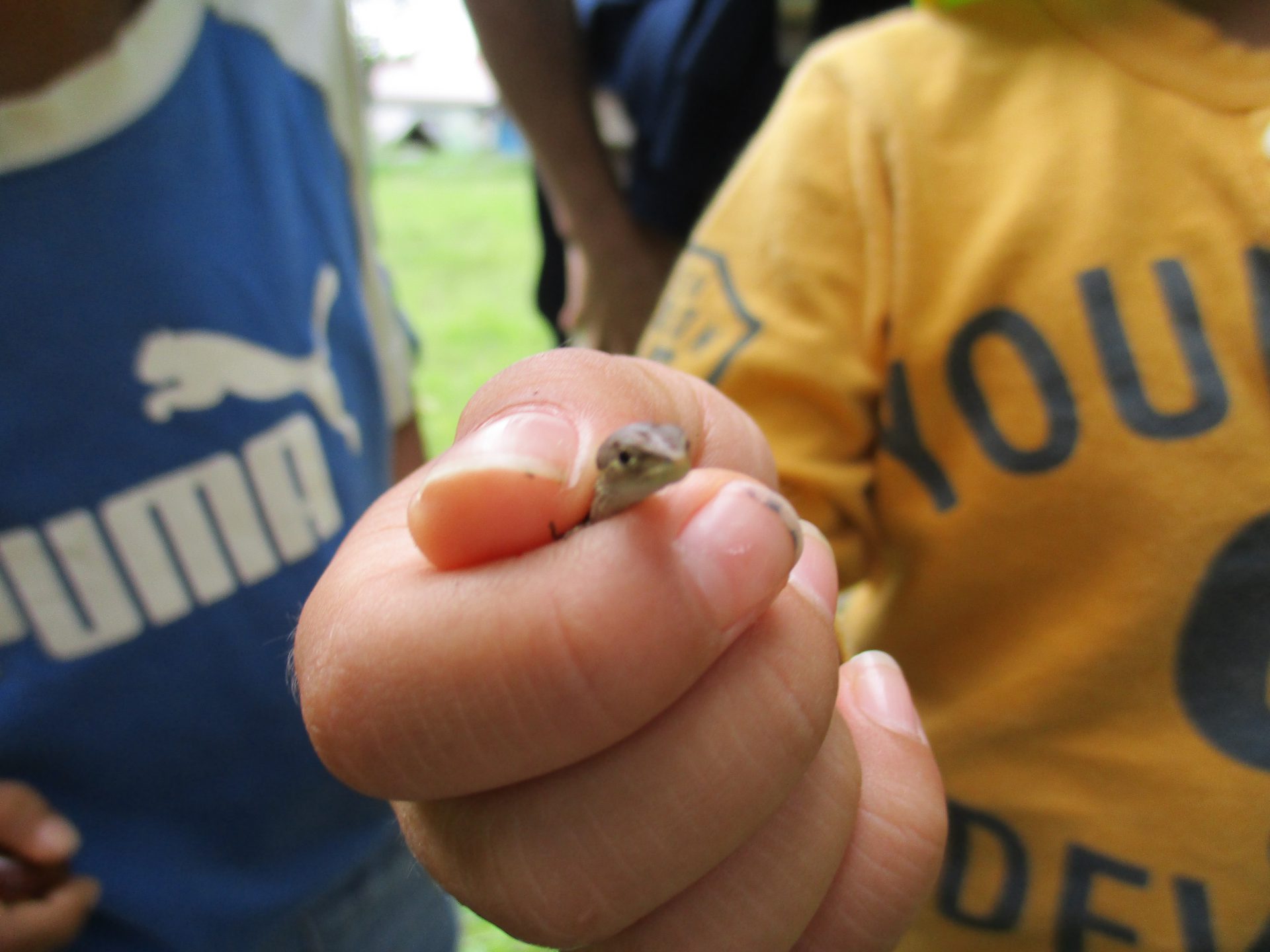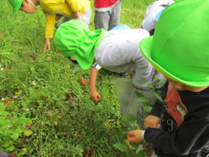 「赤トンボー!」と雨上がりの水たまりに卵を産んでいるトンボを発見しました!「ふたつくっついてる!」と不思議そうな子ども達でした。「水に卵を産んでるんだよ。」トンボさん頑張ってね~!
