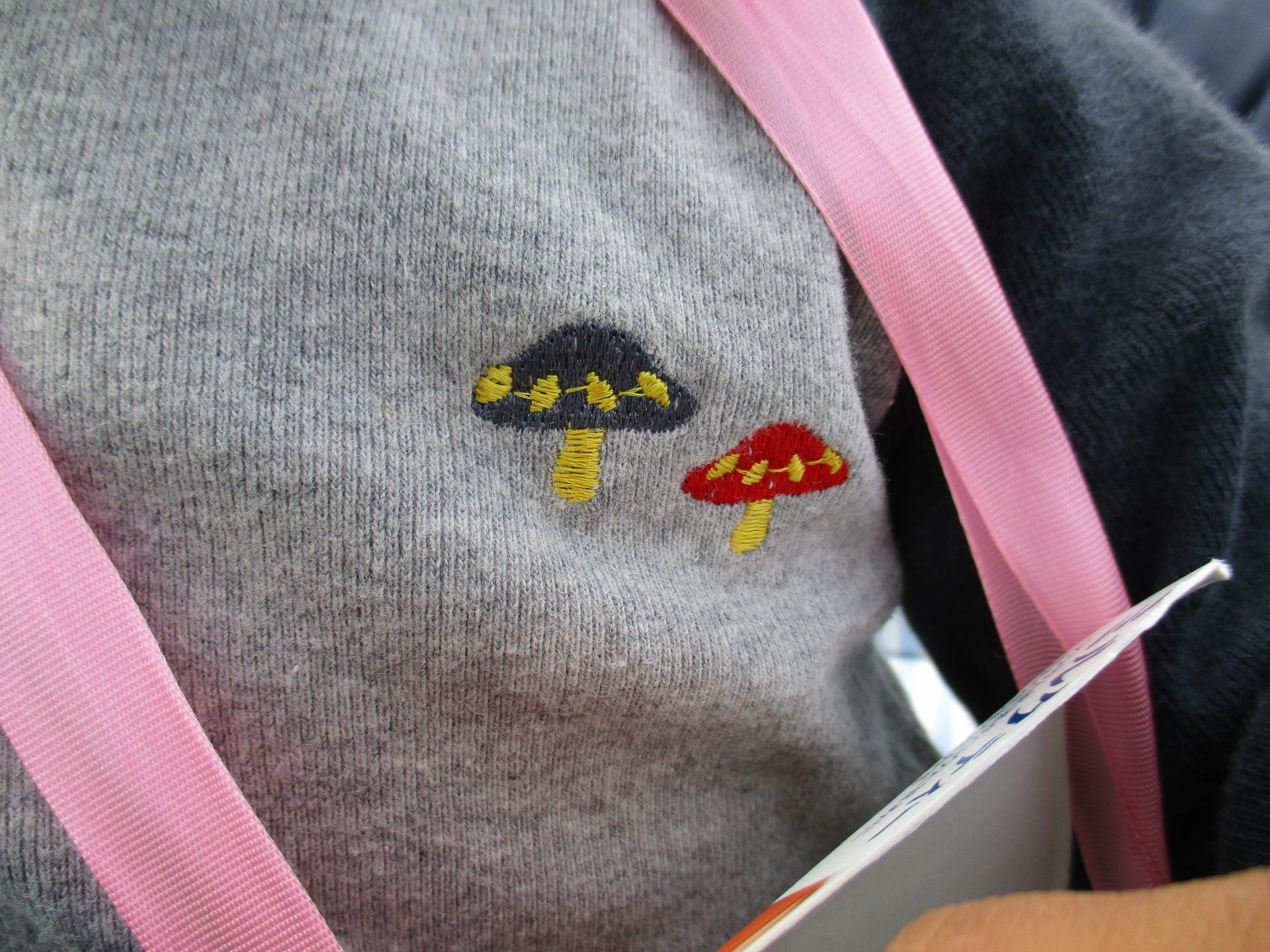 よく見ると、近くに別のキノコの群生も発見しました!「違うきのこだ!」「これは食べれそうだね!」と話している子ども達でしたが、更におもしろいキノコに気が付いた子もいました!一緒に来ていた未満児さんの服を見て「ここにもキノコ!!」と、かわいいキノコも発見しました!