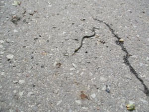 道を渡っているヘビの子どもを発見しました!「がんばれ!ヘビさん!」「車に気を付けてね!」と見送って保育園に帰りました。