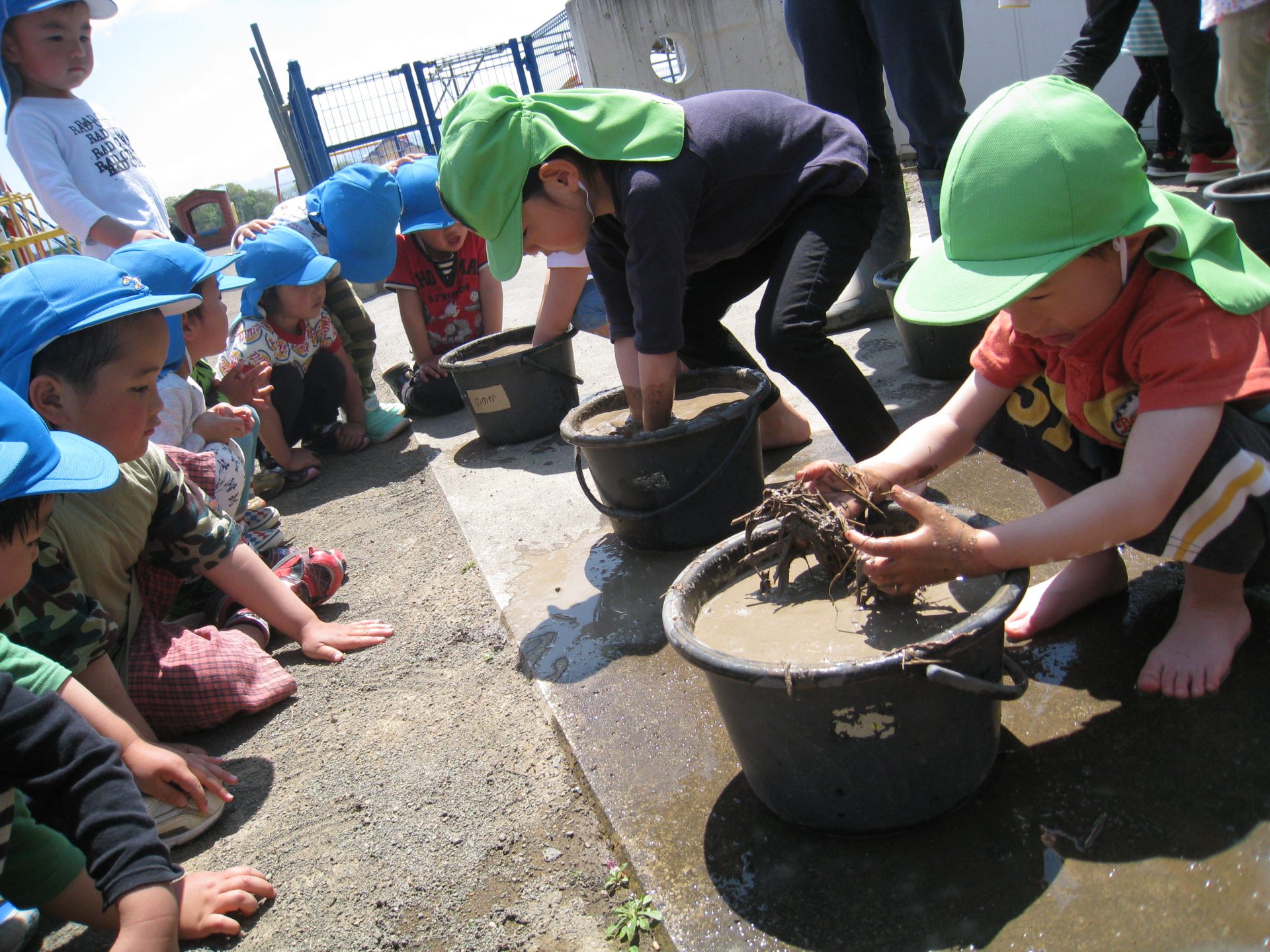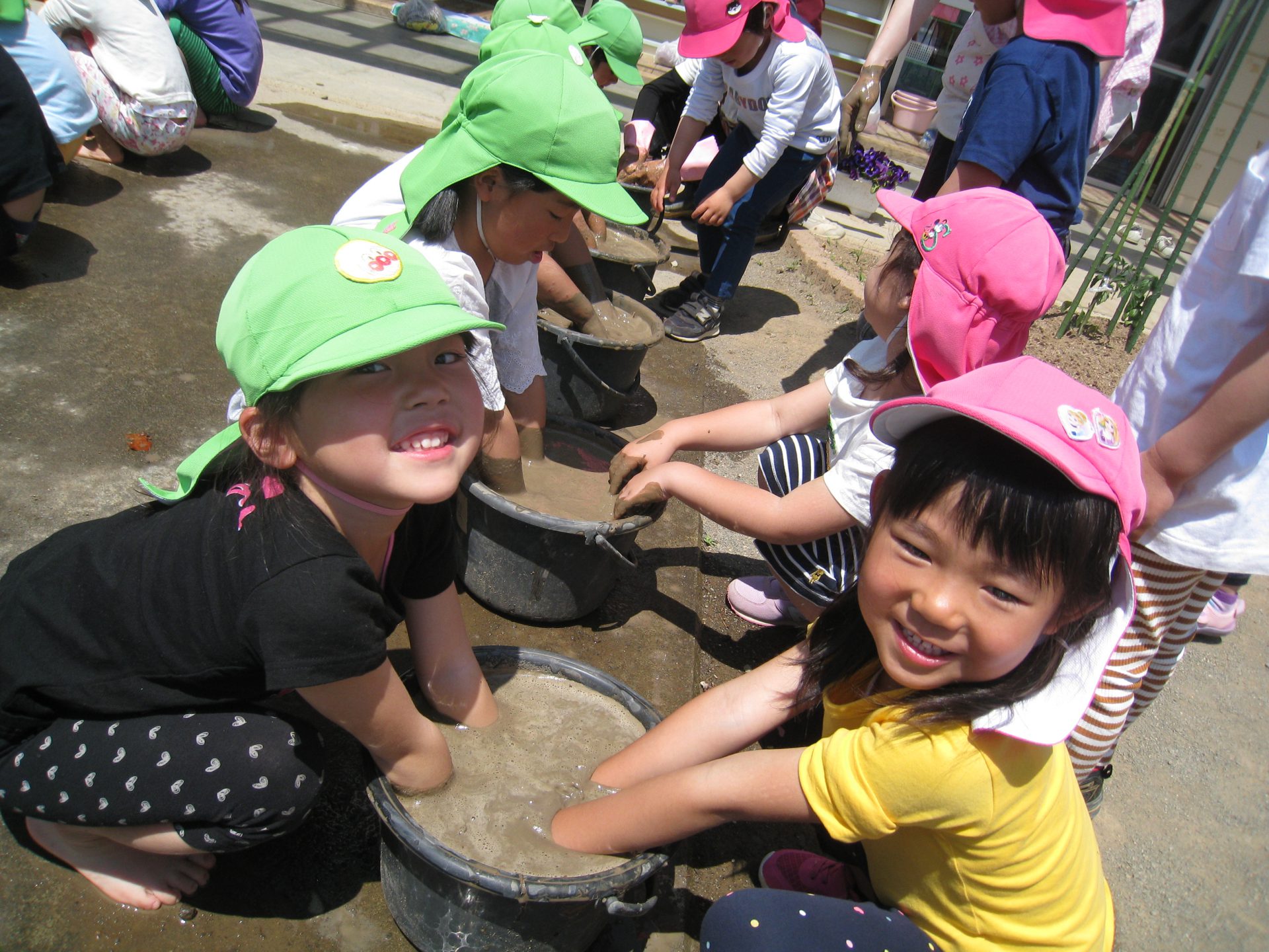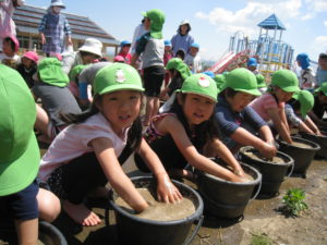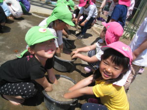 最初は表面を撫でていた子どもたちも少しずつダイナミックに混ぜられるように!