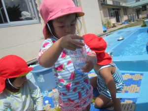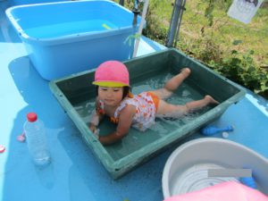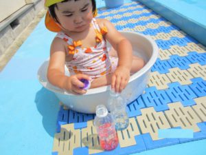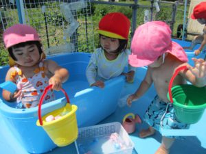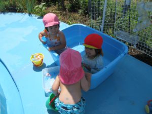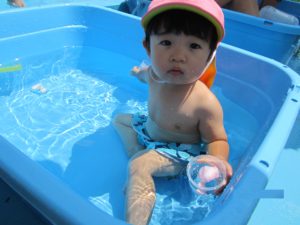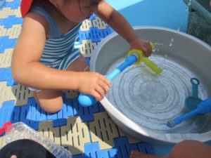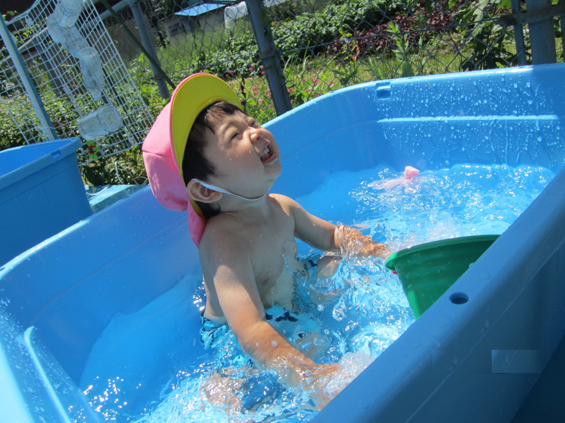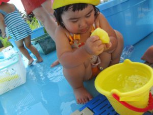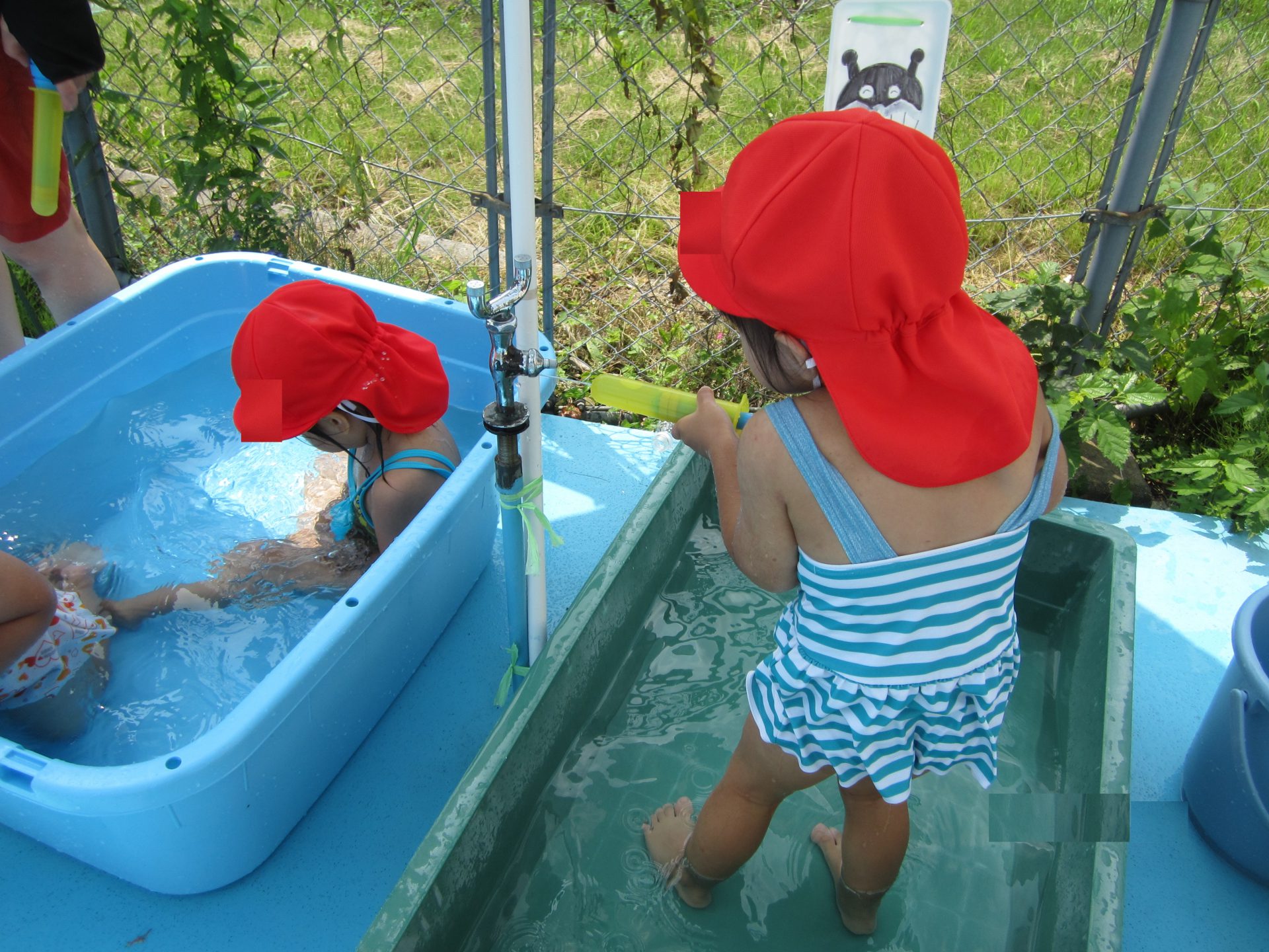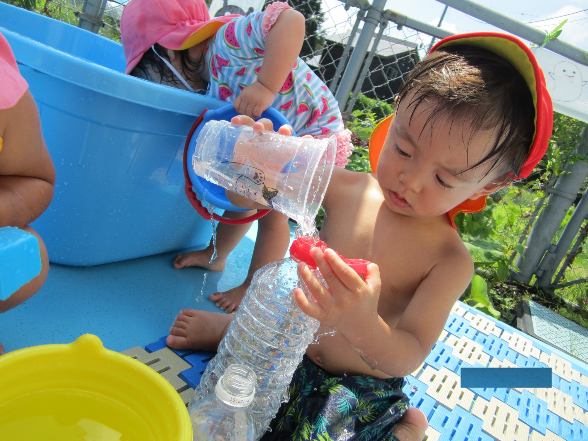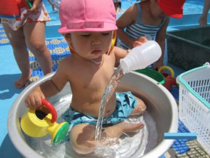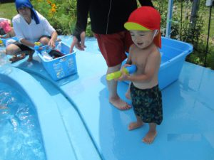 今年は梅雨明けが遅く7月はあまりプールには入れませんでしたが、どろんこ遊びを通して水に触れる機会が多かった1、2歳児さん。水に慣れてからの水遊びでは、どろんこ遊びで使っていた玩具を使ったり、抵抗なくたらいのなかに入っていき、水の冷たさ、音、動きを体全体で触れて、よりいっそう楽しめていたように思います。