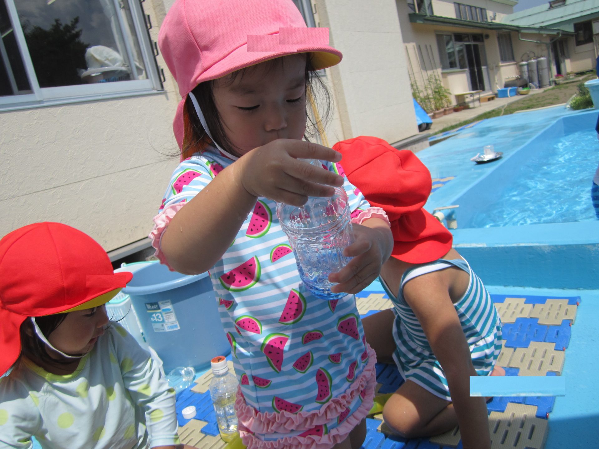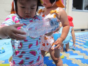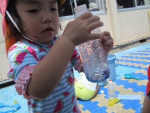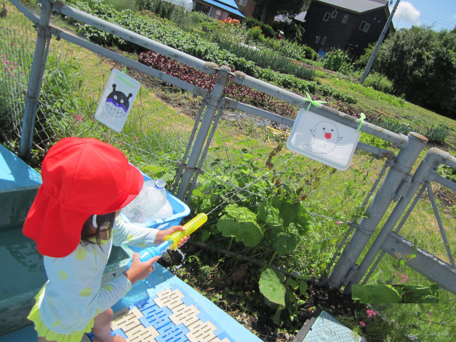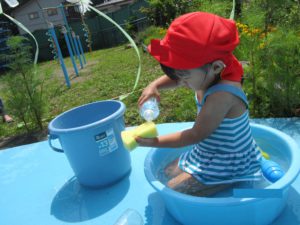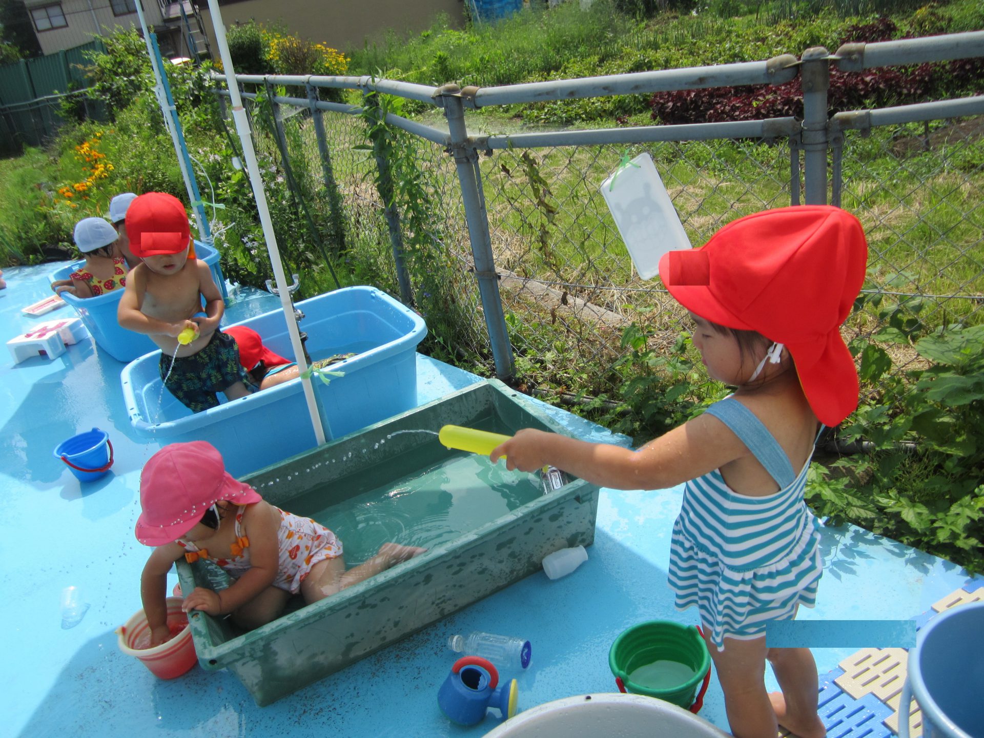 こちらは2歳児さん。2歳児さんは昨年度年上のお兄さんたちが水鉄砲を使って遊んでいたのを見ていたので、水鉄砲を見つけるとさっそく挑戦していました。