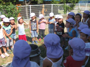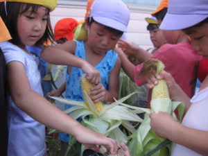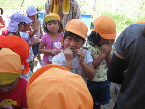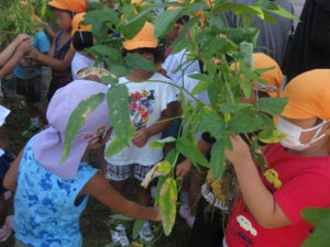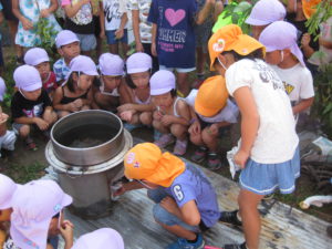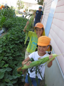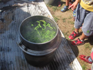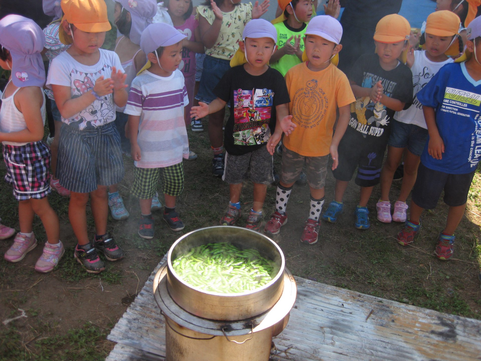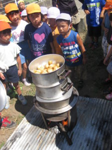 自分たちが作ったものをそこで調理して食べる。種や苗から植えつけて、暑い中がんばって育ててきた野菜を収穫し、それを自分たちでゆでたり、ふかしたりして食べる、という生きる力の為の基本的なサイクルを皆で行うことができてよかったです。今の子どもたちは、かまどを使った経験がほとんどないので、より興味を持って更においしく食べることができました。とてもよい経験となったので、これからも楽しくいろいろな活動をしていきたいです。