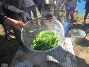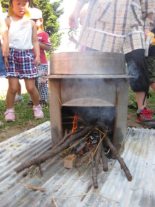 収穫したじゃがいも・えだまめ・とうもろこしを自分たちで何とか調理して食べてみたい!という子供たちの気持ちを大事にして、今回はかまどを使ってゆでたり、ふかしたりしようと決めました。