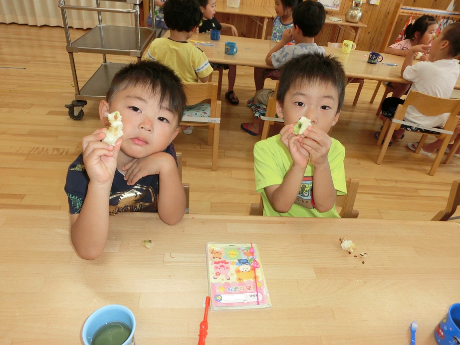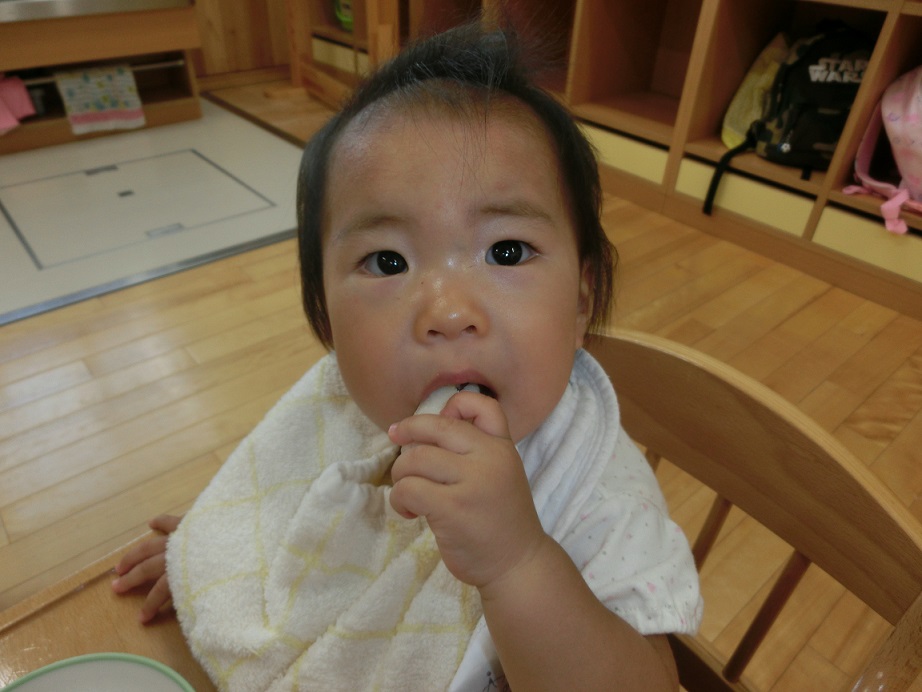 年長児で下の歯がグラグラしていた子が丸かじりをしていたら抜けました。なかなか思い出に残るハプニングになったかなと思いました。
