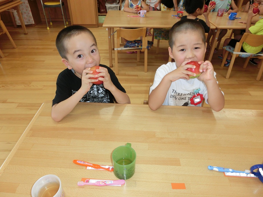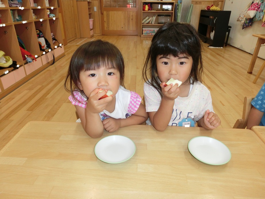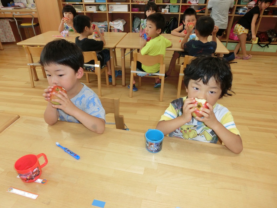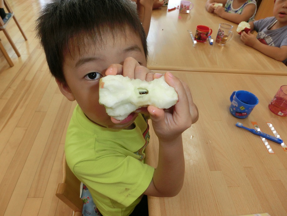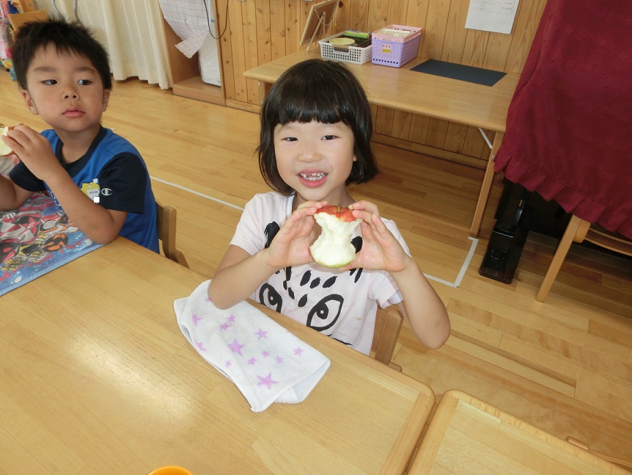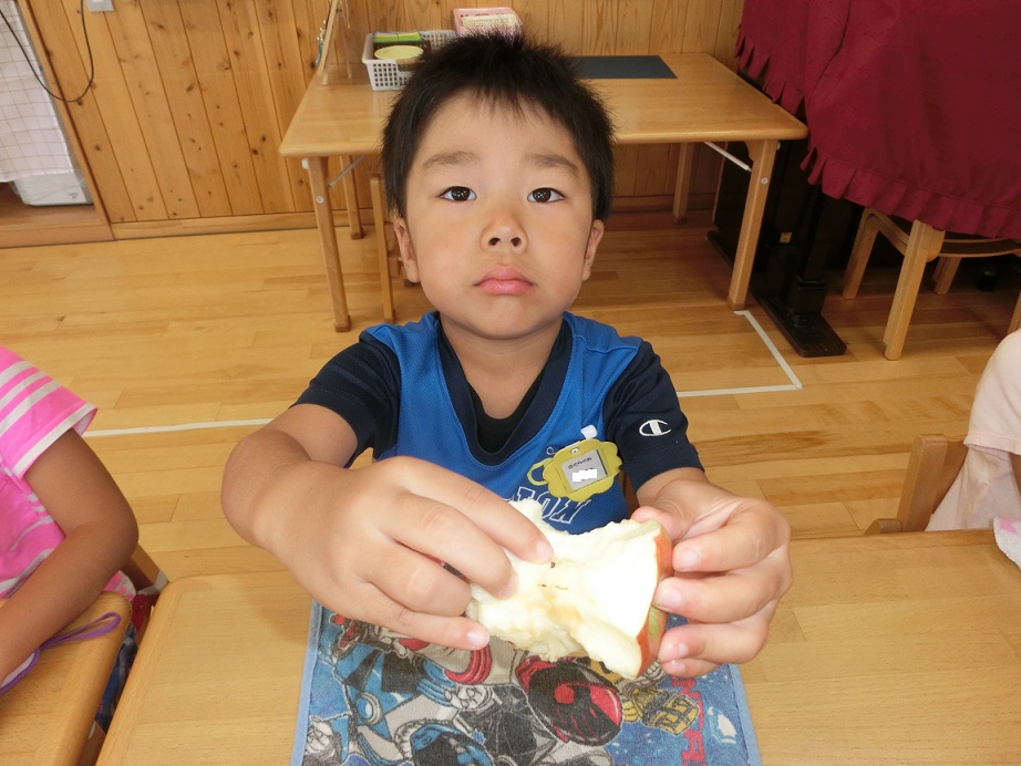 年少からは少し違います。年少児は4分の1の大きさのりんごで芯を取っただけのものです。