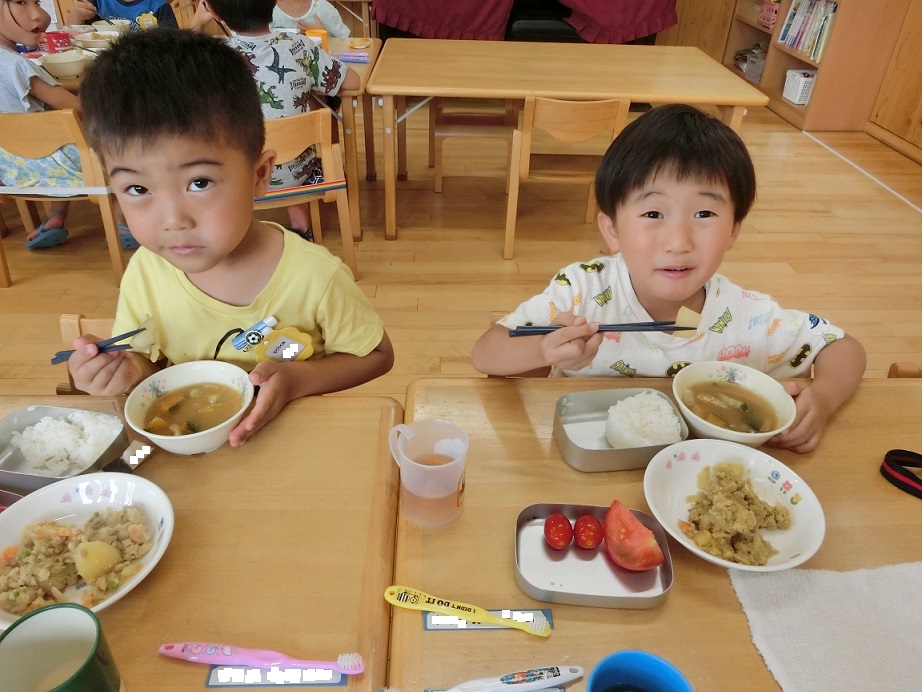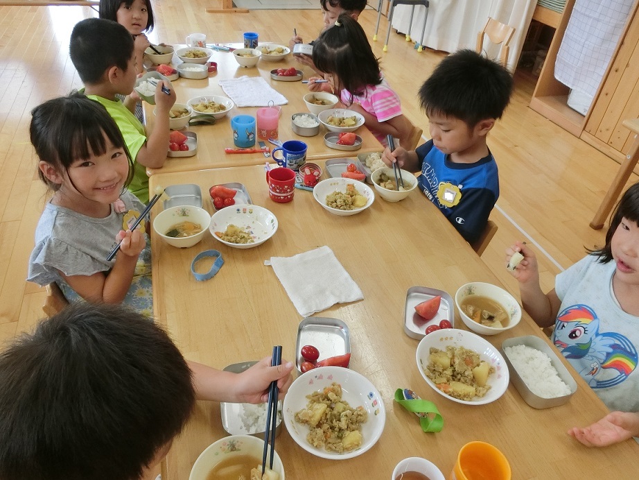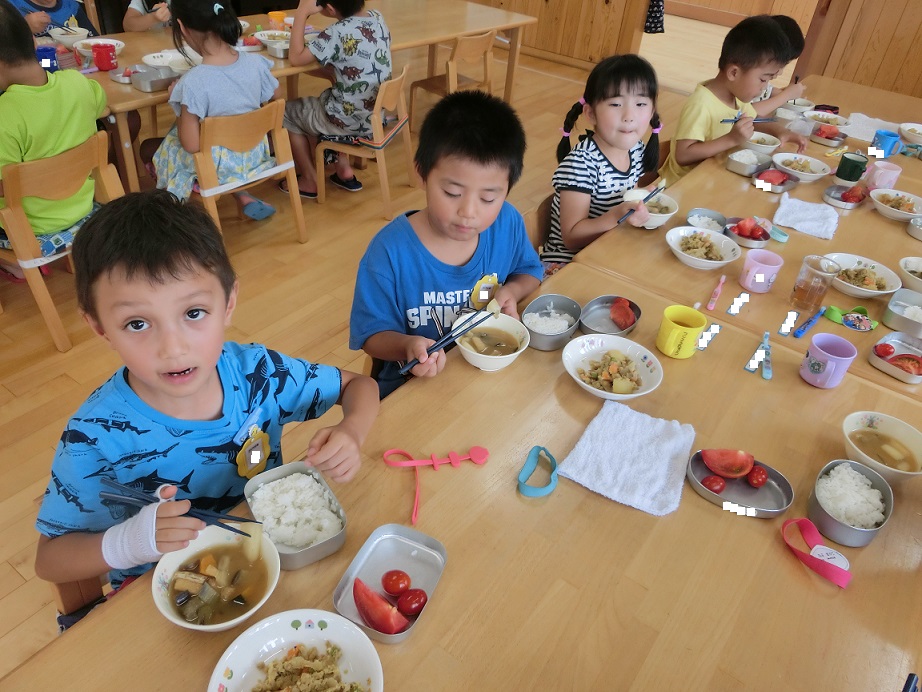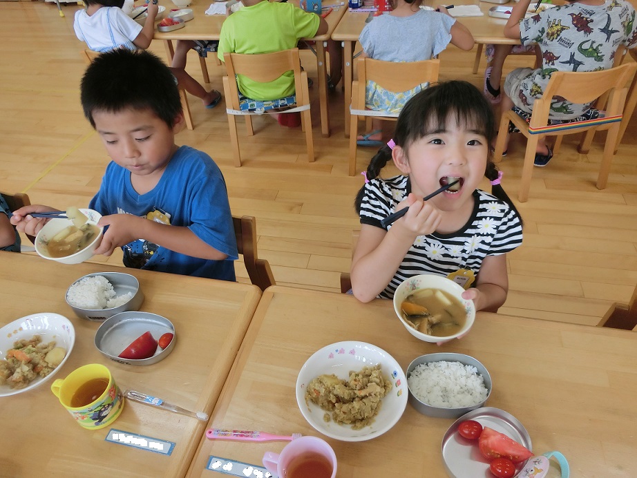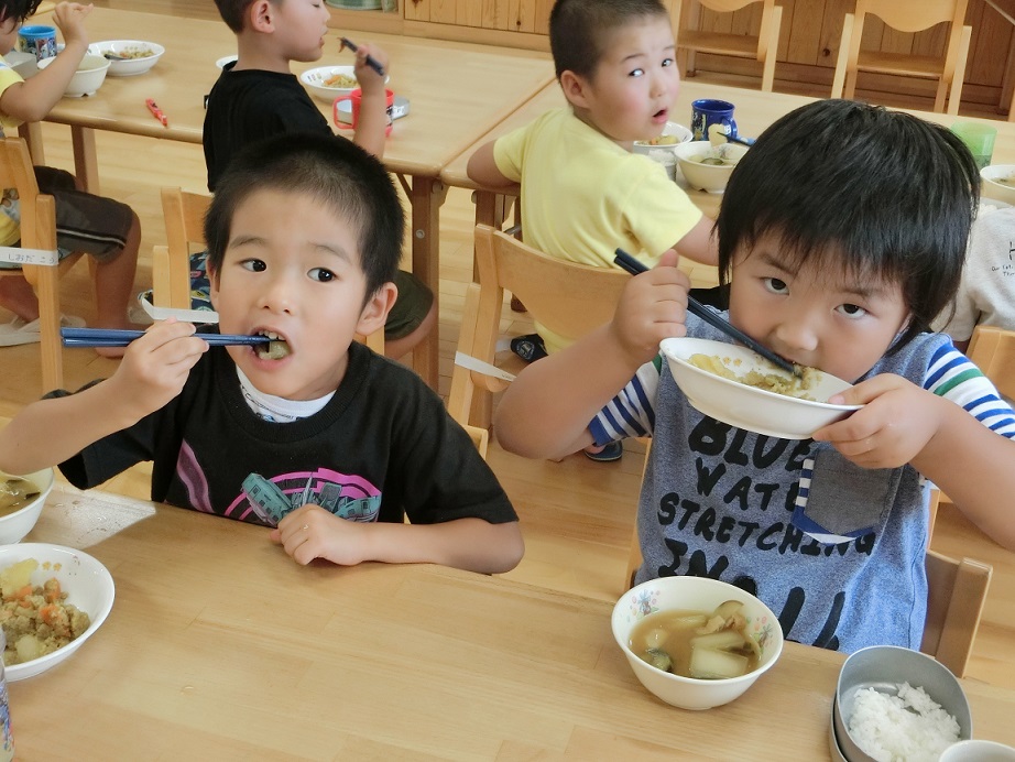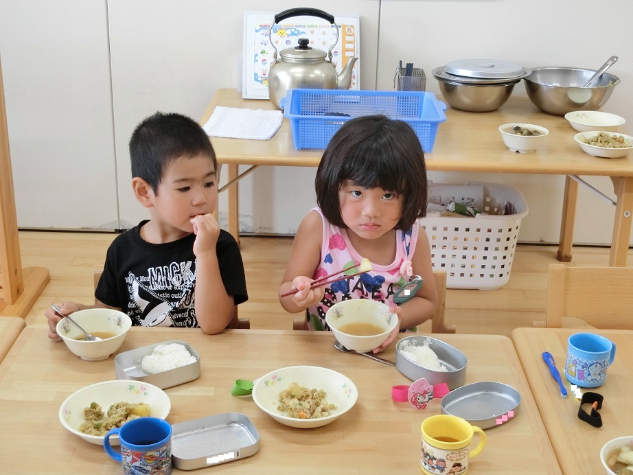 年長児は夕顔を見たことにより味噌汁のほかの食材やおからのカレー風味煮に入っている食材にも興味が出たようでした。