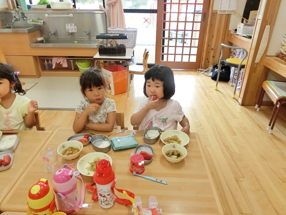「このトマトももらったんだって」「トマト甘くておいしいね」