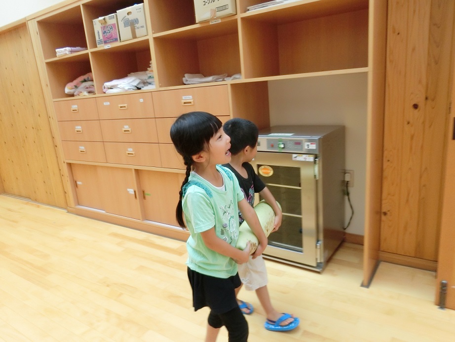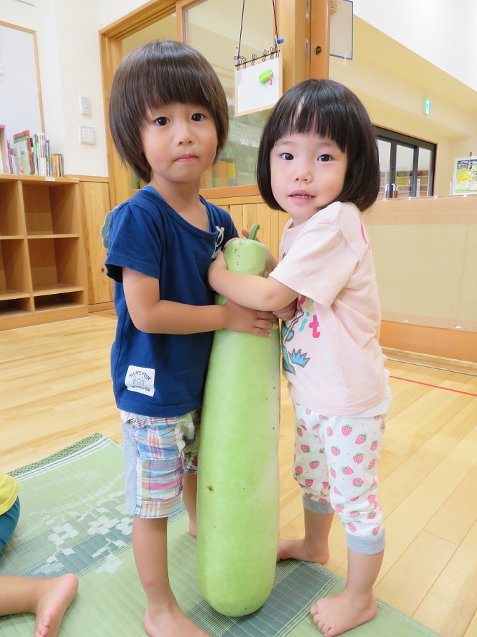 地域の方から「子ども達に食べさせてください」と立派な夕顔とミニトマトをいただきました。夕顔を各クラスに回して見せました。年中児のお当番が夕顔を運びます。