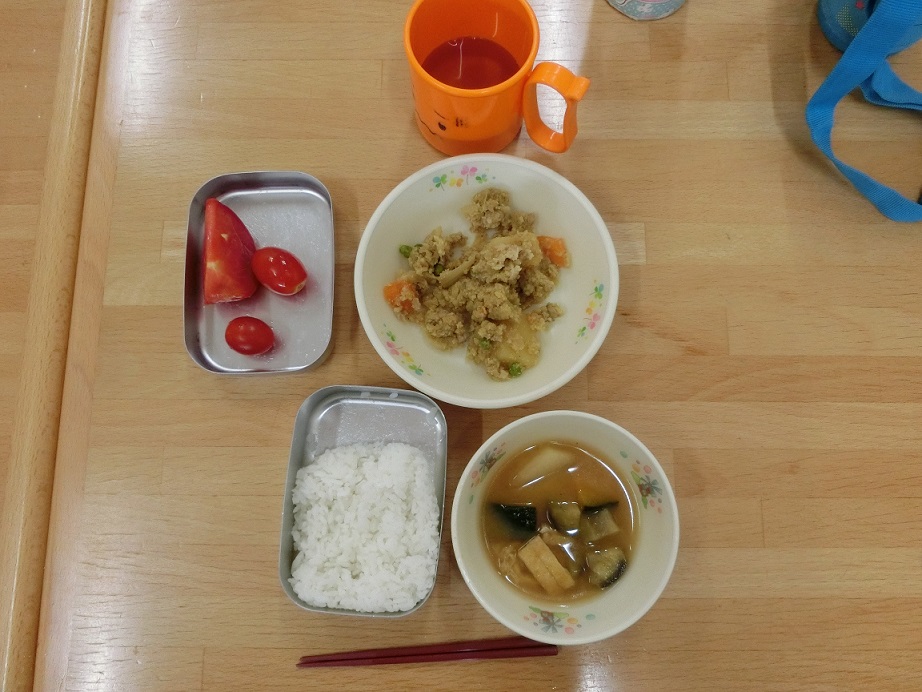 今日の昼食は「おからのカレー風味煮」「夏野菜の味噌汁」「トマト」です。夏野菜の味噌汁に夕顔を入れ、いただいたミニトマトも提供しました。