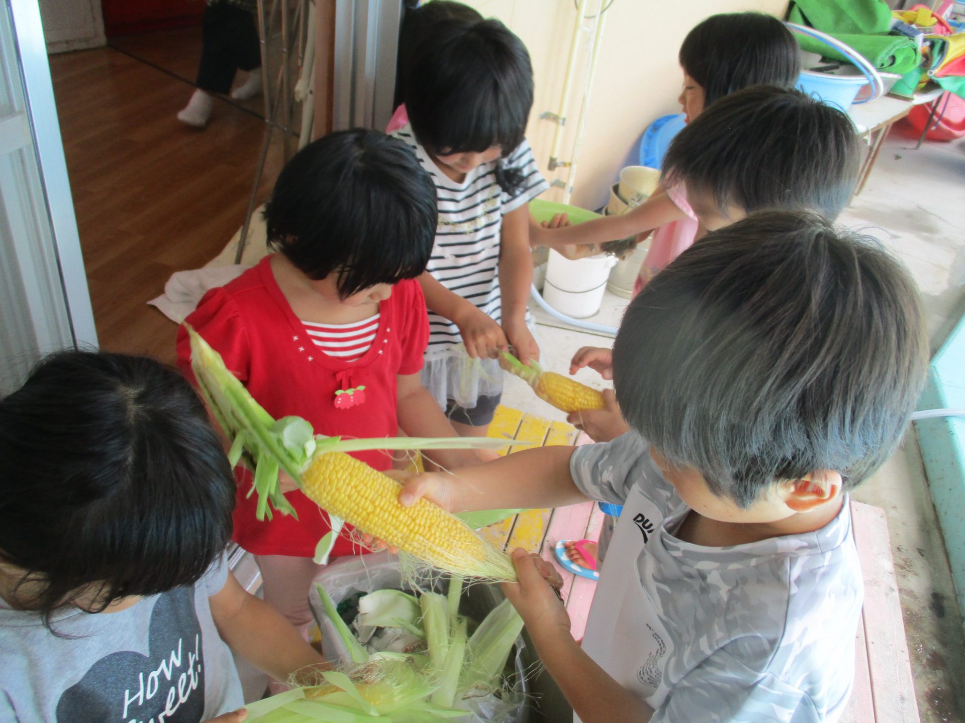 種から育てたとうもろこし。今年は安定しない天気が続いたので生長してくれるかな?と子ども達と心配しながら見守っていました。その心配も8月に入ると消え去り、合計で6本のとうもろこしを収穫!種から育てたことでとうもろこしの生長を始めから終わりまで知ることができ、その中でいろいろな経験や発見をすることができました。またその発見を友だち同士で伝え合う姿がありました。これからも色々な食に関する体験を通して、食べることに親しみ、食材や食に関わることに興味や関心を持ちつづけてほしいなと思います。