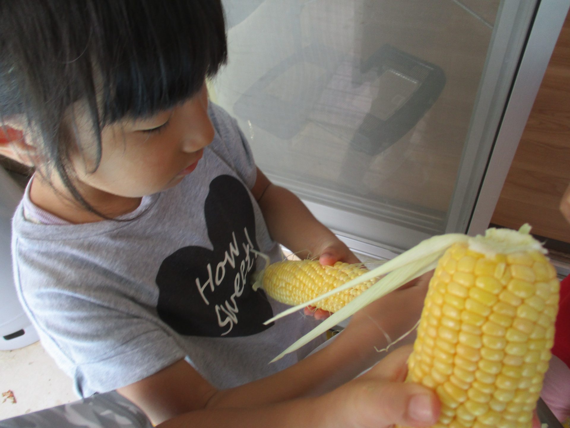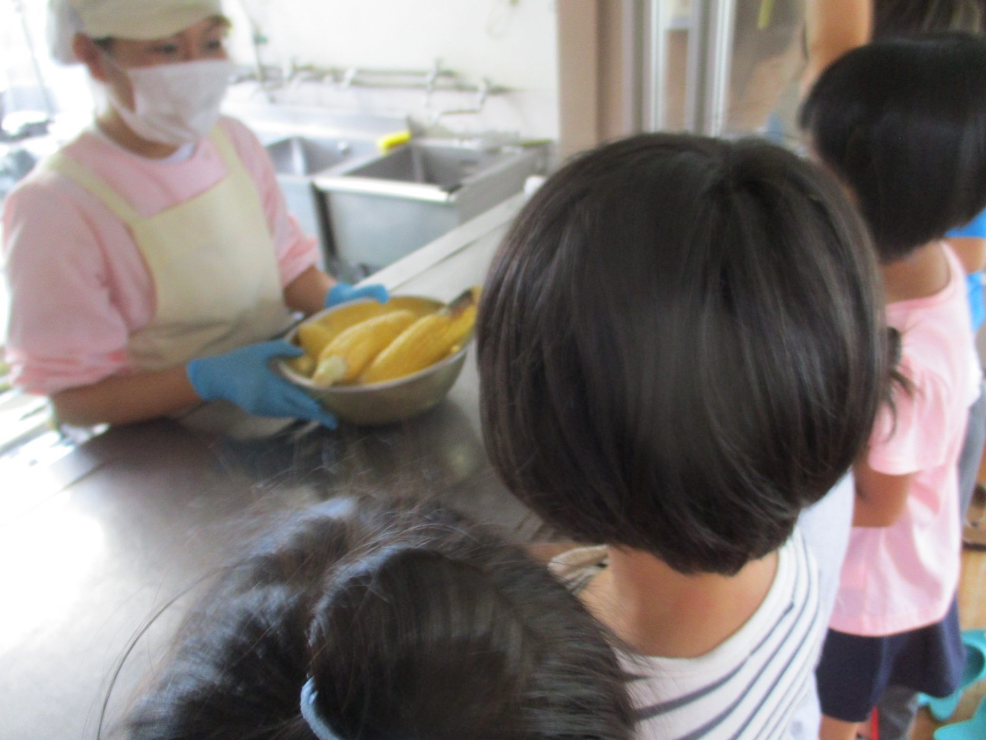 「お願いします!!!」自分たちで育てたとうもろこしだけあって、特別慎重に運んでいて、食べるのが楽しみなんだなと感じました。