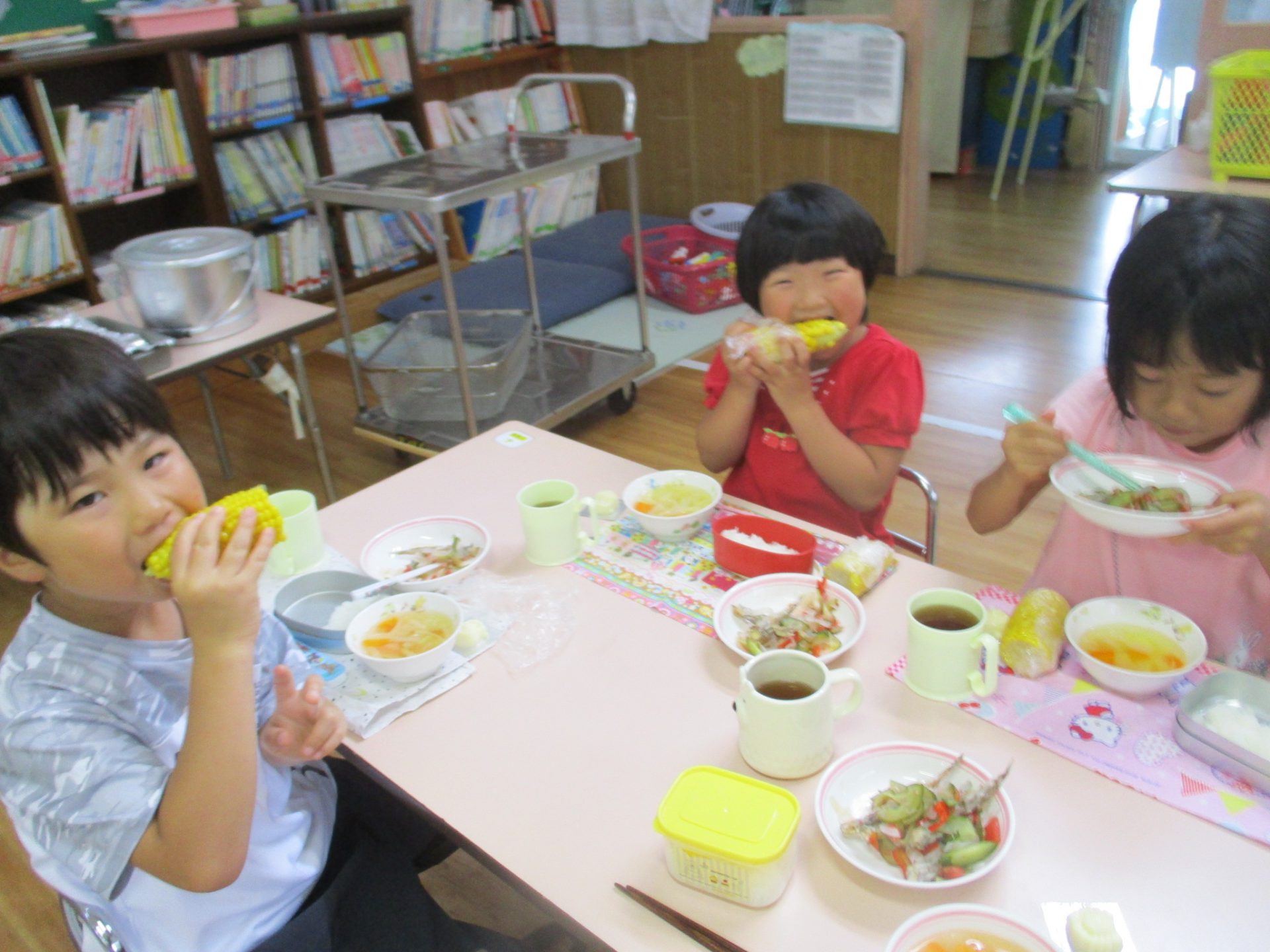 種から育てたとうもろこし。今年は安定しない天気が続いたので生長してくれるかな?と子ども達と心配しながら見守っていました。その心配も8月に入ると消え去り、合計で6本のとうもろこしを収穫!種から育てたことでとうもろこしの生長を始めから終わりまで知ることができ、その中でいろいろな経験や発見をすることができました。またその発見を友だち同士で伝え合う姿がありました。これからも色々な食に関する体験を通して、食べることに親しみ、食材や食に関わることに興味や関心を持ちつづけてほしいなと思います。