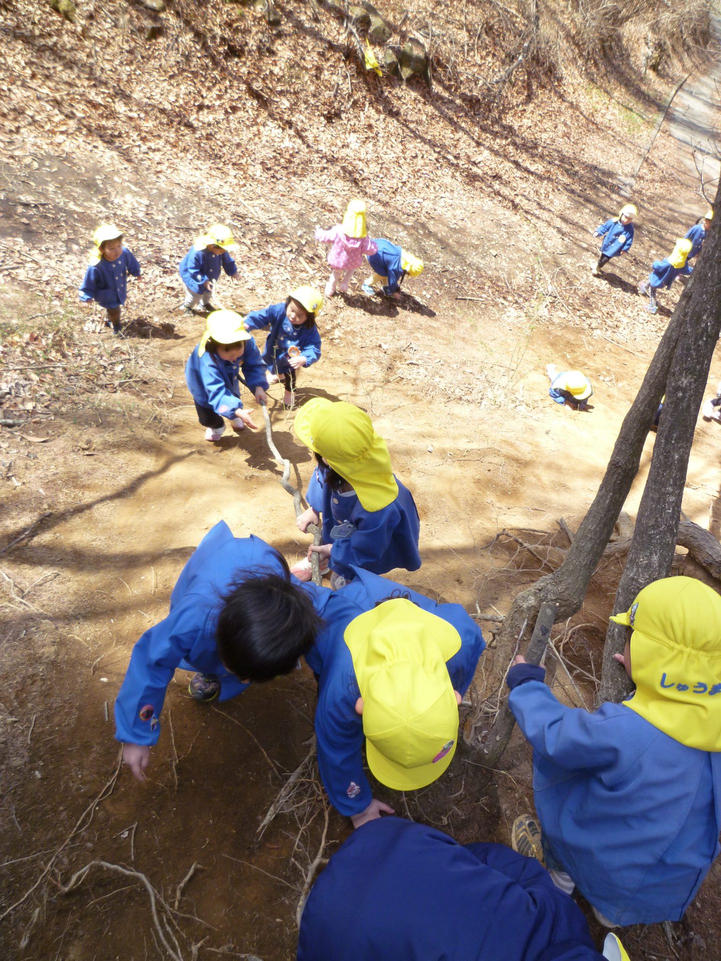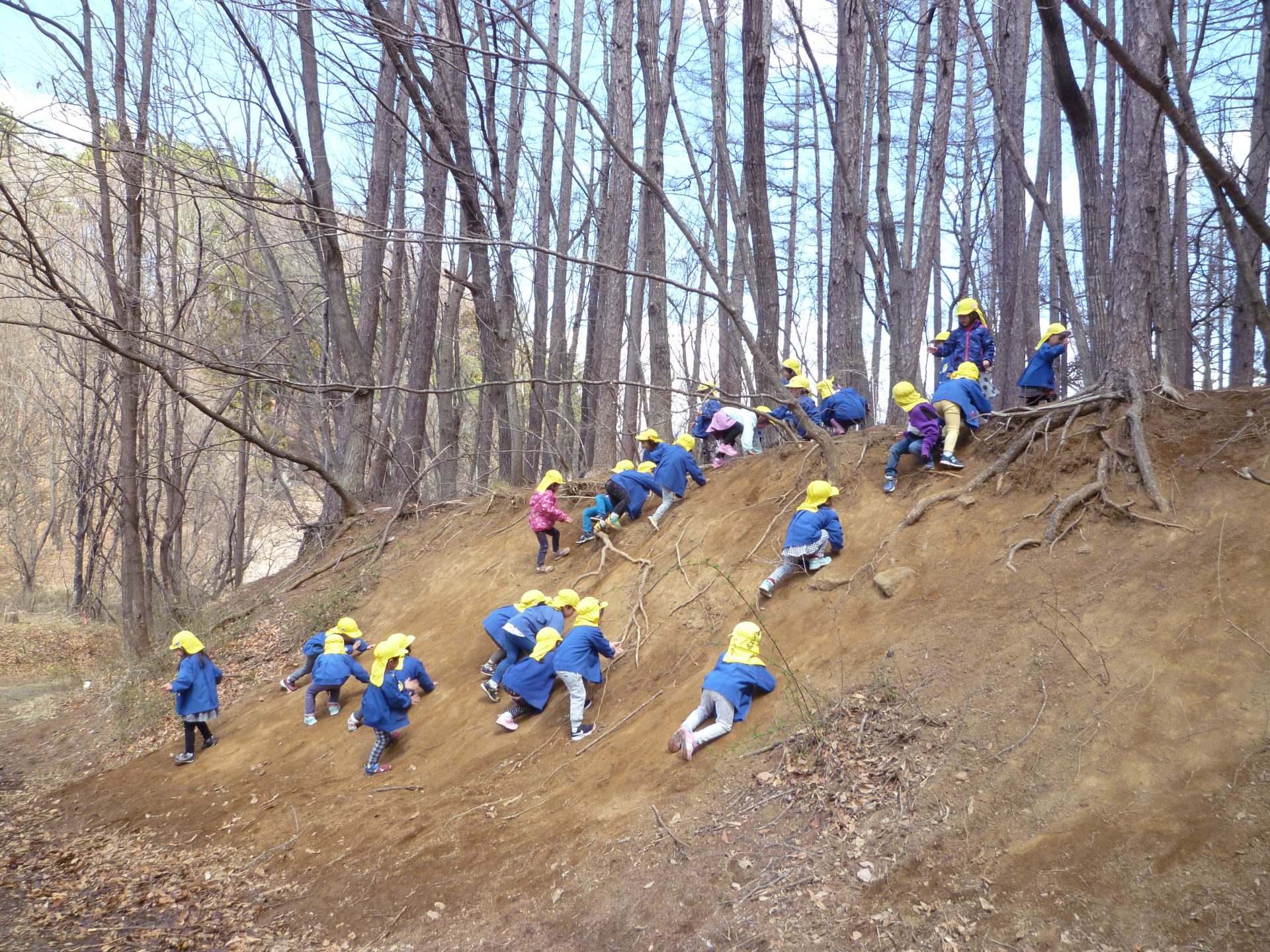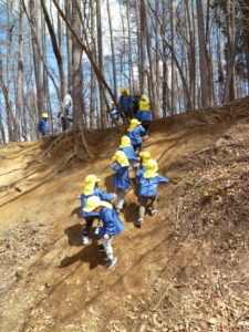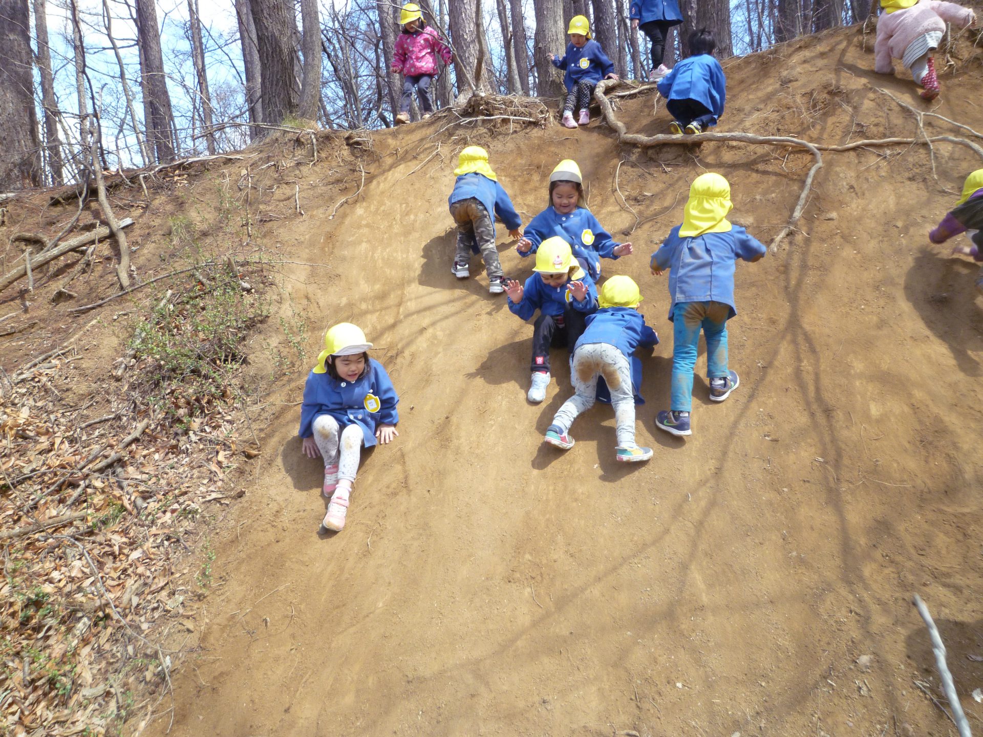 城山保育園の近くには城山があります。昨年から山の土手滑りのことを“おさるのすべり台”と名前を付けて楽しんでいます。