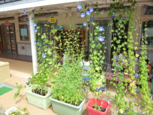 クラスでアサガオを育ててきました。アサガオの花が咲くとアサガオを使って色水を作りをすることを楽しみにしています。