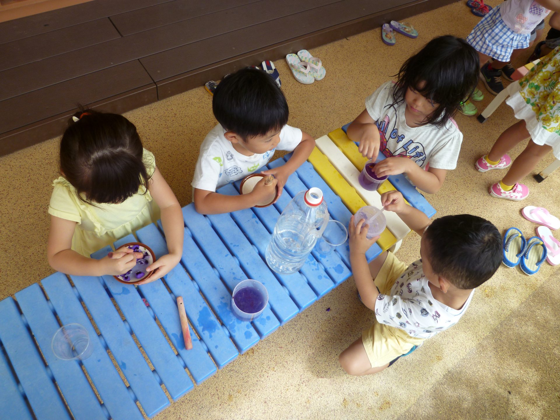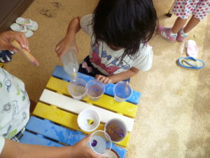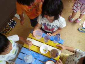 植物を使って、色水遊びを繰り返し楽しんできた子ども達ですが、アサガオの色水遊びを通して、色が変化する不思議さや楽しさを感じる機会になったと思います。