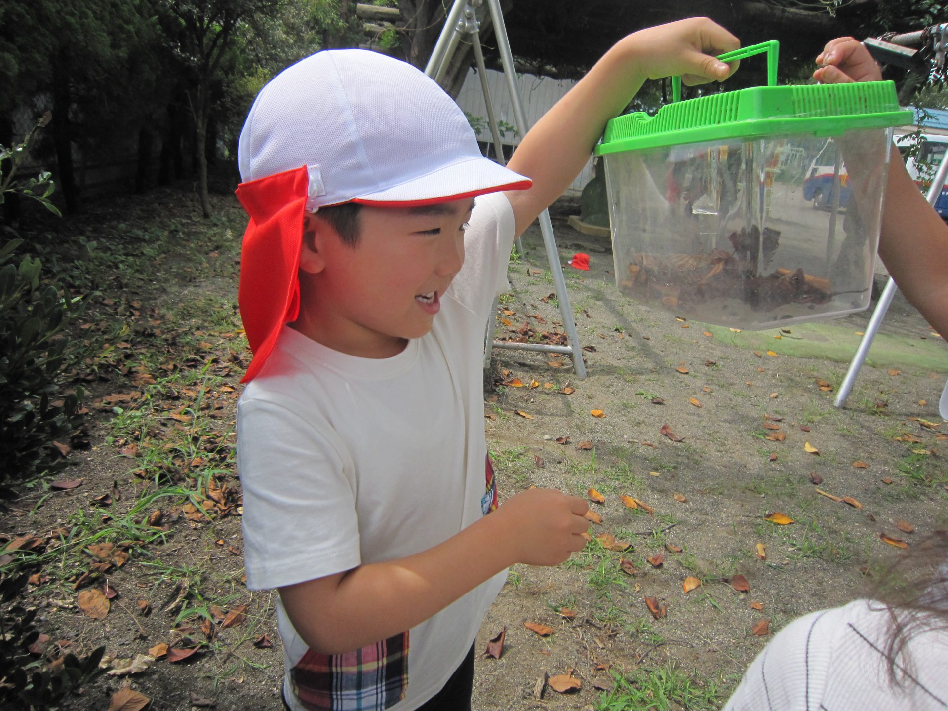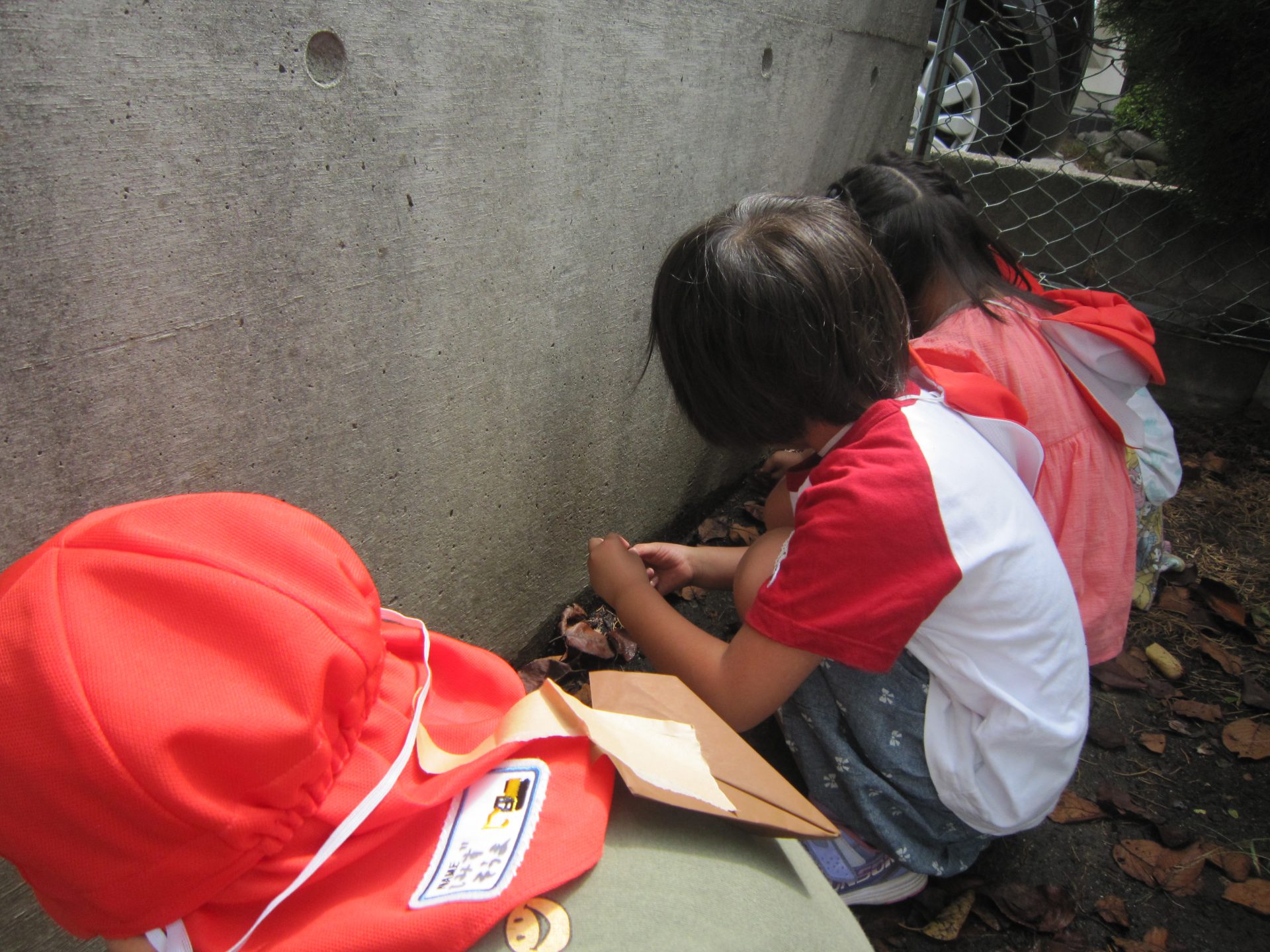 ダンゴムシを見つけ盛り上がっている年中組の子ども達の様子を見ていた年少組さんが「見せて見せて!」と興味深々にやってきました。そこから年少組さんもダンゴムシ探しが始まります。